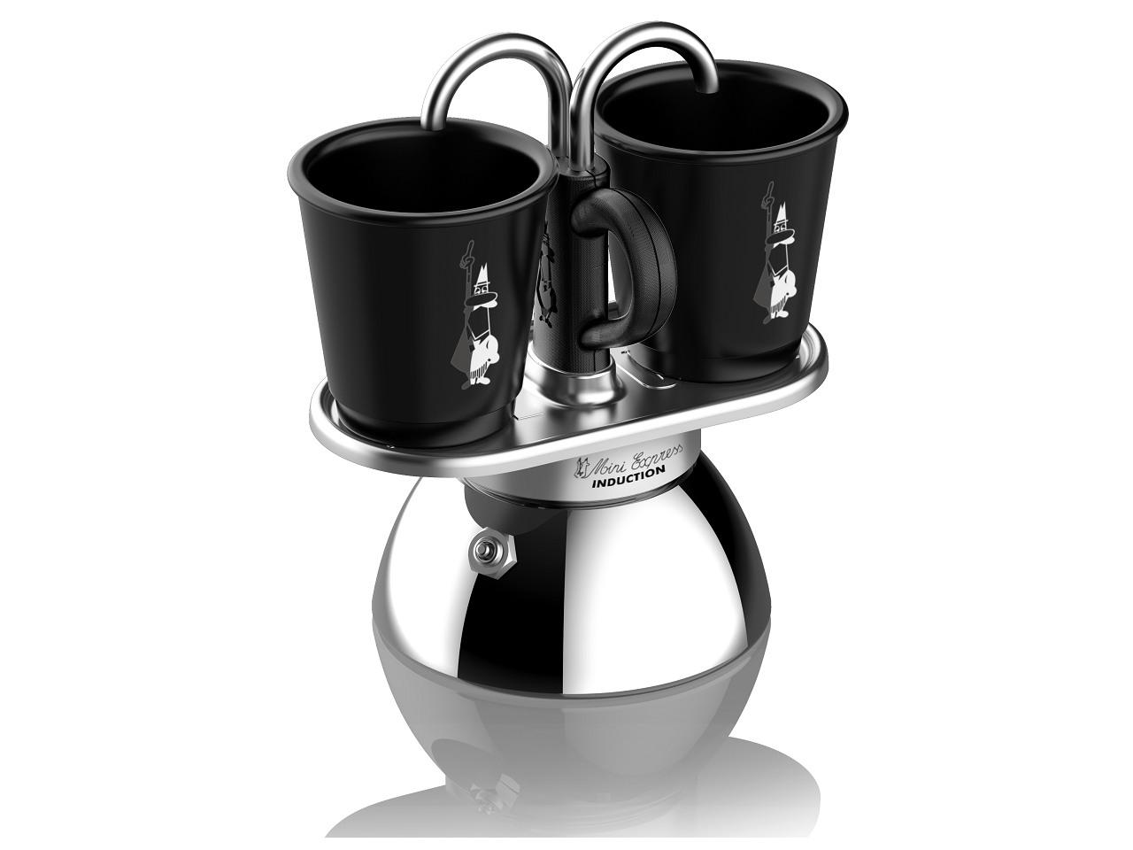 Bialetti kávéfőző porcelán csészékkel és aljjal. A Bialetti Mini Express kávéfőző a hagyományos kotyogós kávéfőzők elvét követve működik azzal a különbséggel, hogy a lefőzött kávé közvetlenül a csészékbe folyik két kis kivezető csövön keresztül. A csésze mosogatógépben tisztítható. Indukciós főzőlappal is komaptibilis.