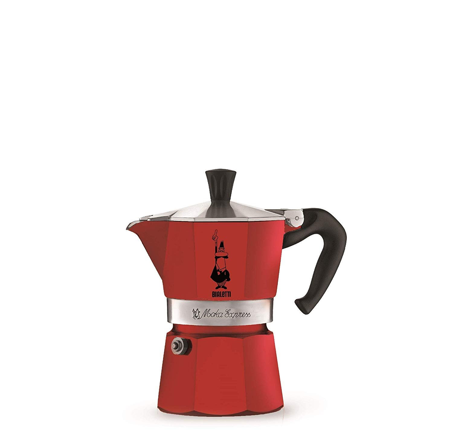 Moka Expresszo piros alumínium eszpresszó készítő. Klasszikus divatos piros színű. Polírozott alumíniumból készült, ergonomikus fogantyúval és biztonsági szeleppel. Könnyű és egyszerű tisztíthatóság. Alkalmas minden típusú tűzhelyzhez (kivéve az indukciós).