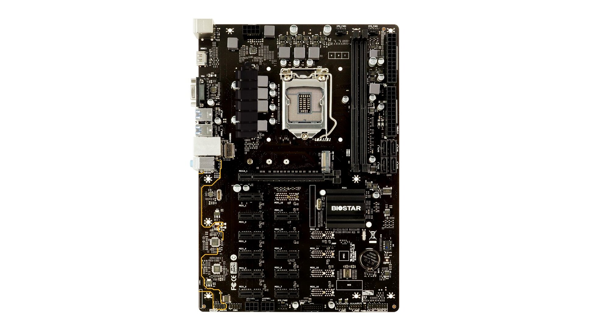 PCI Express foglalatok: 1× PCIe 3.0 x16, 11× PCIe 3.0 x1 (a maximálisan használható VGA-k száma a VGA driver és a bányász szoftver függvénye)