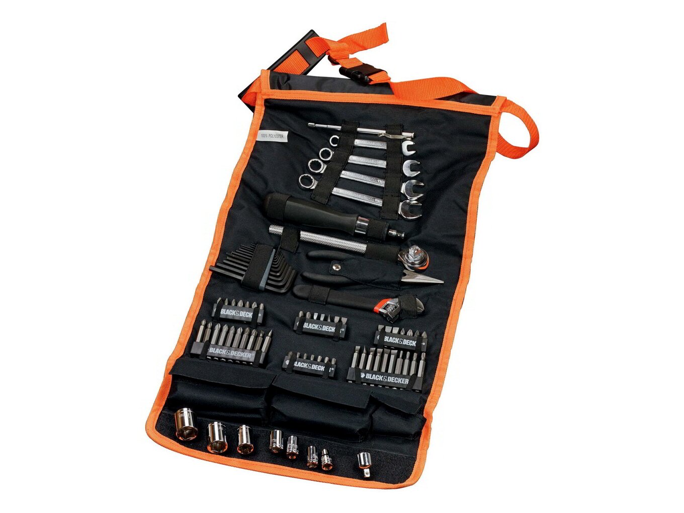 A Black & Decker A7063-QZ 76 darabos szerelőkészlete ideális a szerelői munkákhoz. Tartalmaz hosszú és rövid biteket, megfordítható racsnit és dugókulcsokat, csavarkulcsokat, fogókat, mágneses mutatót és adaptereket. A készlet helytakarékosan tárolható és szállítható a hordozószíjjal ellátott szerszámos gurulós táskában.