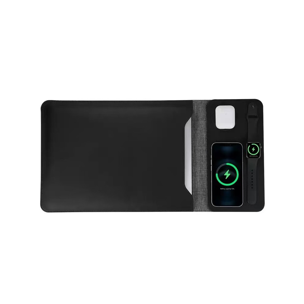 A tok letisztult kialakítása lehetővé teszi, hogy az asztalra kiterítve kényelmes egérpadként működjön. Közben telefonja, okosórája és fülhallgatója vezeték nélkül tölthető, így minden fontos eszköz egy helyen, rendezett formában kezelhető.