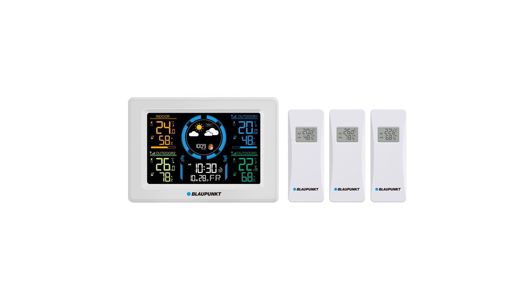 A Blaupunkt WS40WH egy időjárás-állomás három vezeték nélküli hőmérséklet- és páratartalom-érzékelővel, abszolút barometrikus nyomásméréssel, hőmérséklet- és páratartalom trendjelzővel, órával és naptárral, riasztási funkcióval és holdfázis kijelzéssel.