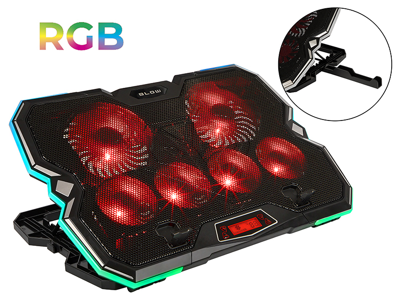 Főbb jellemzők: 6 ventilátoros hűtés • Állítható döntési szög (6,5–35°) • Látványos RGB háttérvilágítás 11 móddal • 6 fokozatú ventilátorsebesség-szabályozás • Oldalra rögzíthető telefontartó • Stabil, fémráccsal erősített felület • USB-ről működtethető kialakítás • Csendes működés (26–30 dBA)