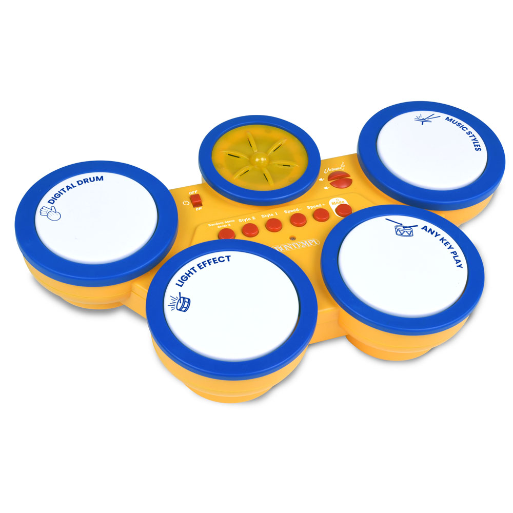 Ez a vidám, sárga-kék digitális dob 4 ütőfelülettel, és rengeteg funkcióval rendelkezik annak érdekében, hogy a zenész csemeték minél lenyűgözőbb előadással örvendeztethessék meg a családot és a barátokat. Ezen a 4 felületen 12 ütőshangszer szólaltatható meg 6 zenei stílusban. Állítható rajta a tempó és a hangerő, valamint ritmikus fényeffekteket bocsát ki. Sőt mi több, még tanuló funkcióval is rendelkezik.