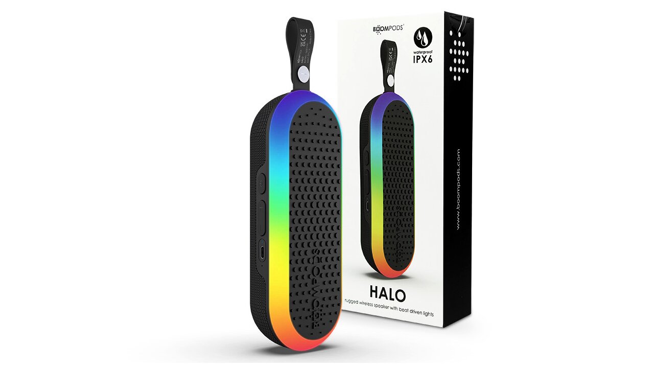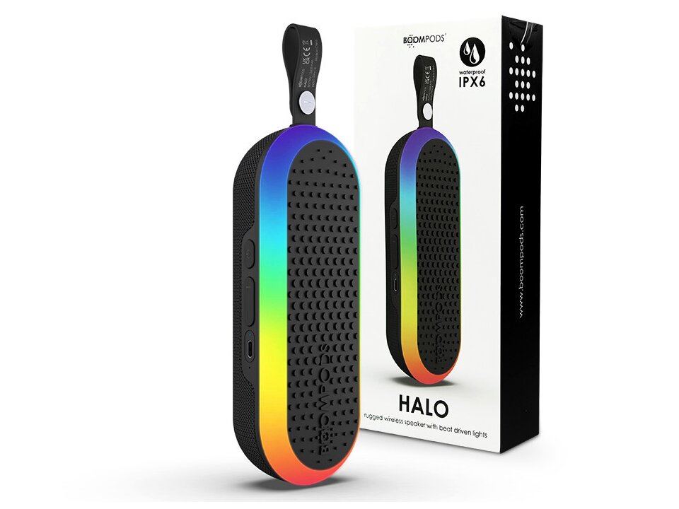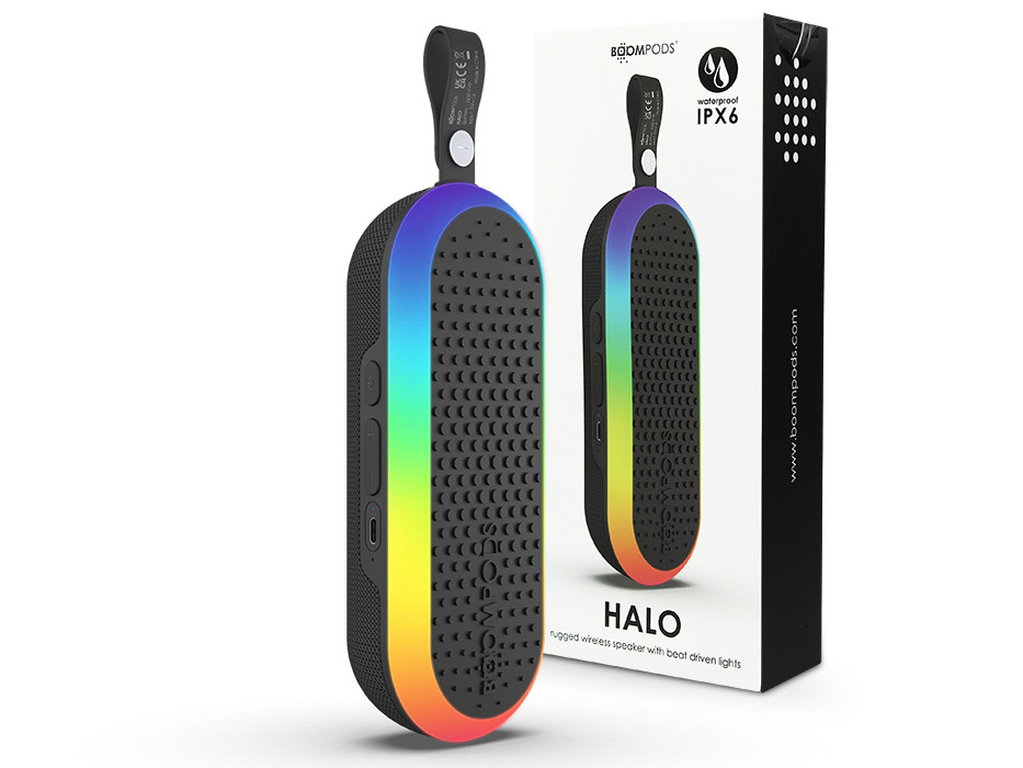 - Boompods HALO 12 wattos sztereó vezeték nélküli hangszóró 5 fénymóddal, amely szinkronizálható a zenéhez vagy beállítható hangulatvilágításként.
