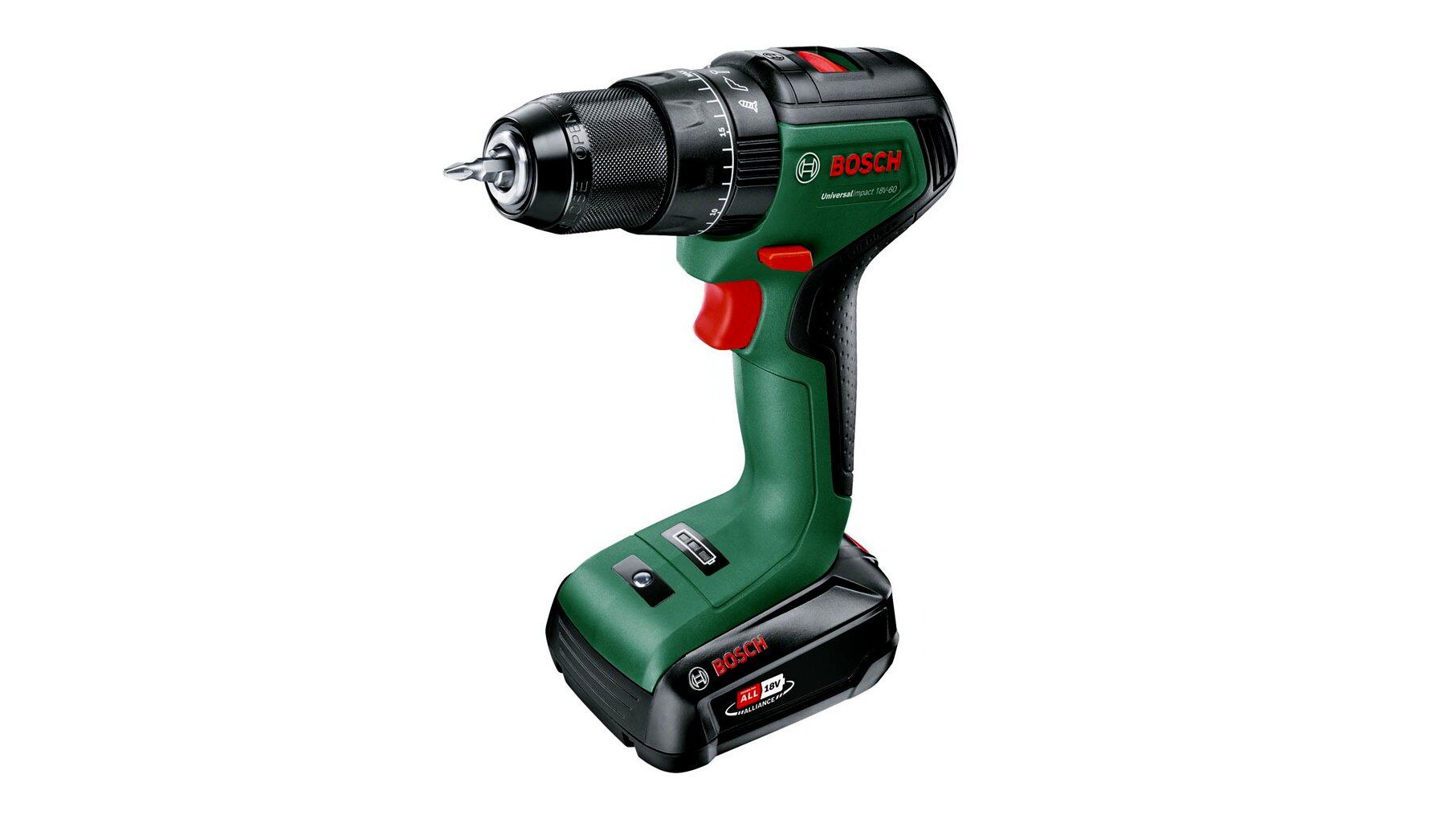 Az UniversalImpact 18V-60 akkumulátoros ütvefúró a Bosch-tól egy multi-talentum ütvefúráshoz, fúráshoz és csavarozáshoz. A hasznos akkumulátoros szerszám 2 sebességes bolygóműves sebességváltóval és 20 nyomatékbeállítással, valamint 2 fúróbeállítással rendelkezik, így csavarozáskor optimális nyomatékot, fúráskor pedig ideális sebességet biztosít. A lassú, erőteljes első fokozat ideális a nagyobb átmérők csavarozásához és fúrásához, míg a második fokozat gyors fúrási haladást tesz lehetővé a kis átmérőknél. Az egyhüvelykes, 13 mm-es fúrótokmánynak köszönhetően az automatikus reteszeléssel ellátott fúrófejek és csavarhúzófejek könnyedén cserélhetők. Az ergonomikus kialakítású, kompakt ütvefúró beépített munkalámpával is rendelkezik, amely megkönnyíti a sötét helyeken való észlelést. A nagy teljesítményű beépített LED szórt fényt biztosít sötét környezetben a munkadarabok optimális megvilágításához. A kefe nélküli motor jelentősen hosszabb élettartamot és nagyobb teljesítményt ötvöz. Elektronikusan vezérelt, alacsonyabb a hőkibocsátása, érintkezés- és kopásmentesen működik. Az UniversalImpact 18V-60 ütvefúró a kompetens mindenes a fúrási és csavarozási munkák széles skálájához fában, fémben, műanyagban és falazatban. A lítium-ion technológiának köszönhetően nincs memóriahatás és nincs önkisülés, az akkumulátor mindig készen áll a használatra. Az UniversalImpact 18V-60 akkumulátoros ütvefúró a Power for Alliance termékcsalád része. Egyetlen újratölthető akkumulátor számos különböző márkájú szerszám széles választékát képes működtetni.