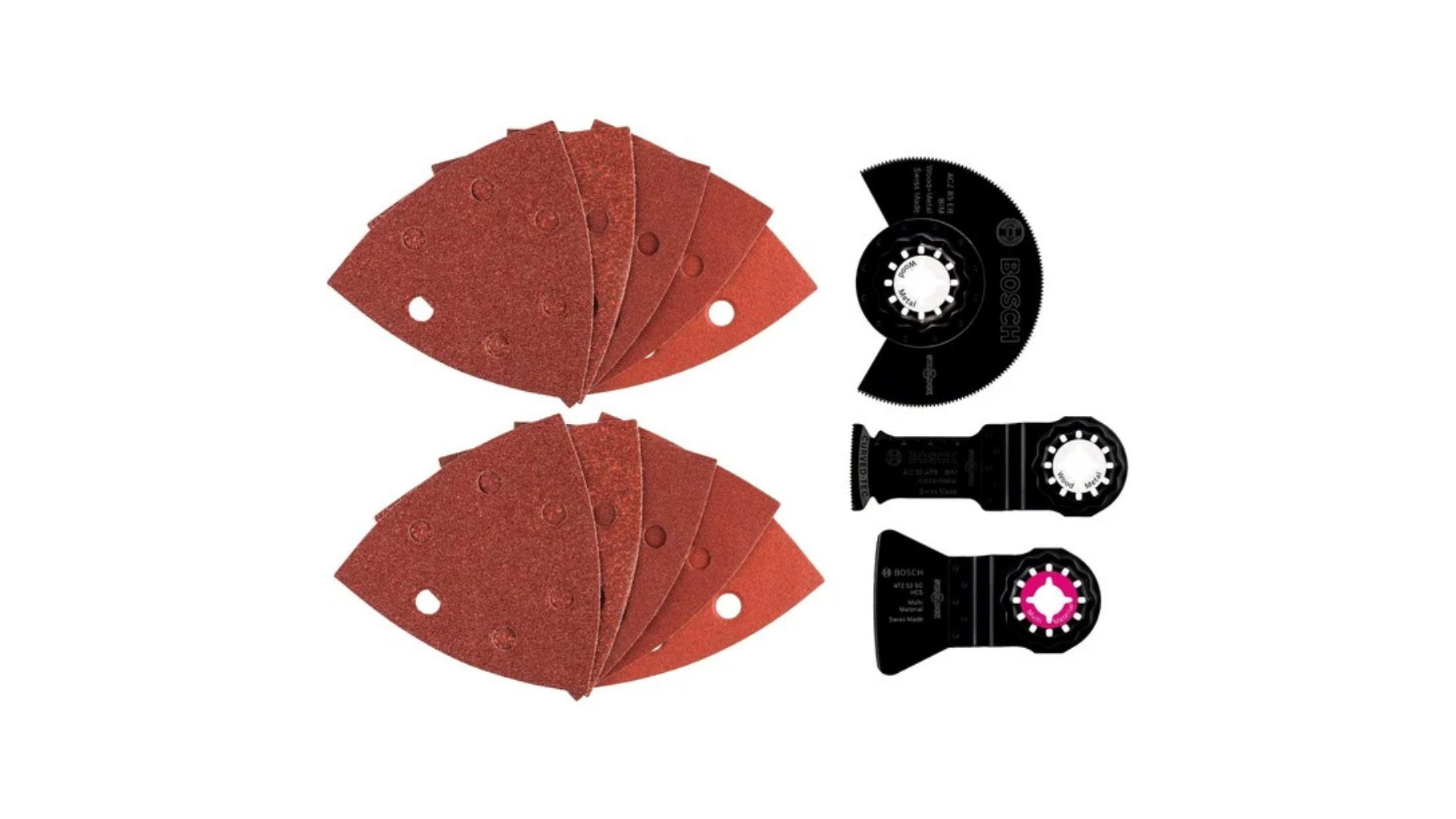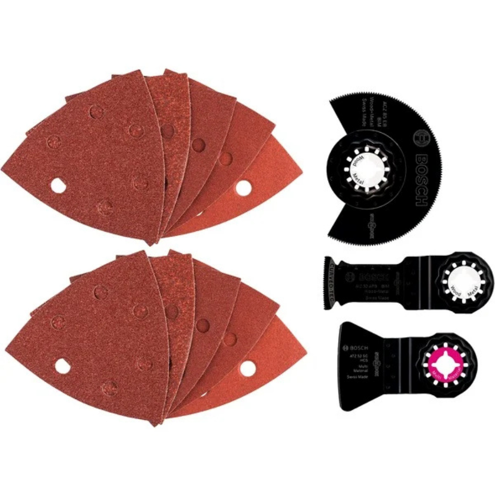 • Kompakt, mégis teljes körű tartalom: kaparó, szegmens fűrészlap, merülő fűrészlap, különböző csiszolólapok.
