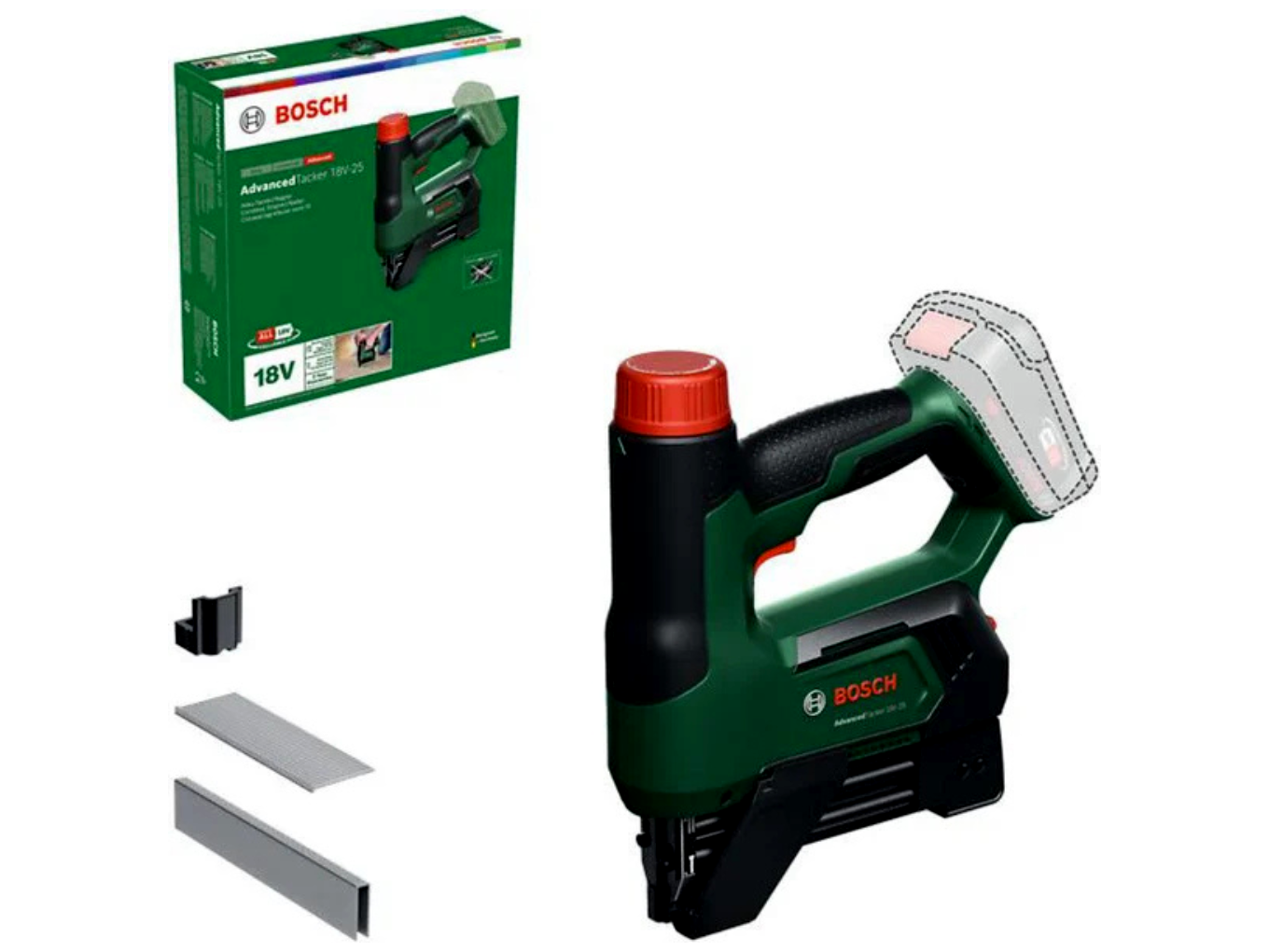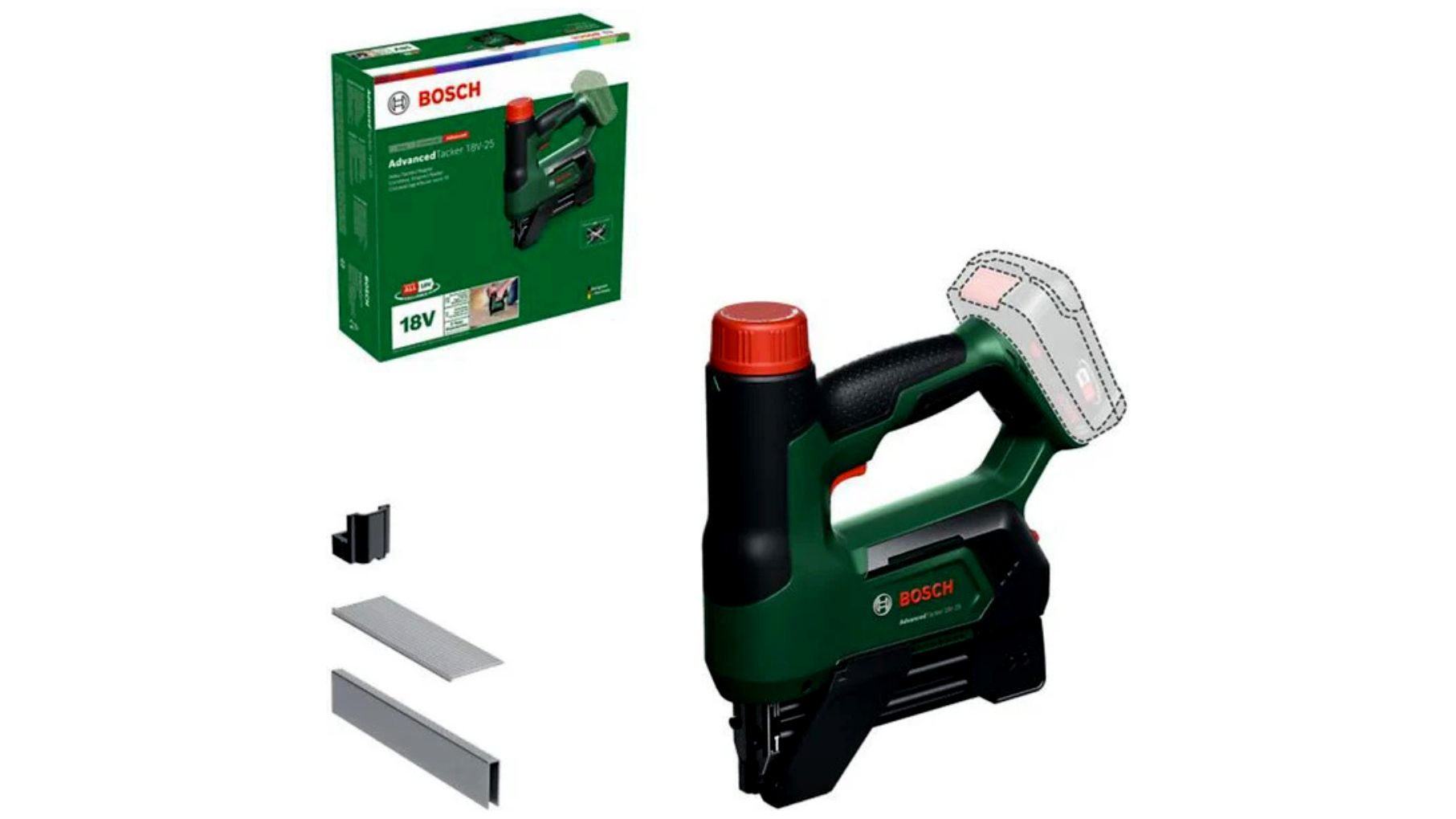 Alapadatok: típus: elektromos (akkus) tűzőgép és szegezőgép, szín: zöld/fekete, üzemmód: akkumulátoros működés, üzemi feszültség: 18 V, akkumulátortípus: lítium-ion, rendszer: 18 V POWER FOR ALL ALLIANCE (Bosch, GARDENA, Steinel, Gloria Garten, Wagner, stb.), cikkszám: 100188958, gyártói szám: 06032A7100, EAN: 4053423257335