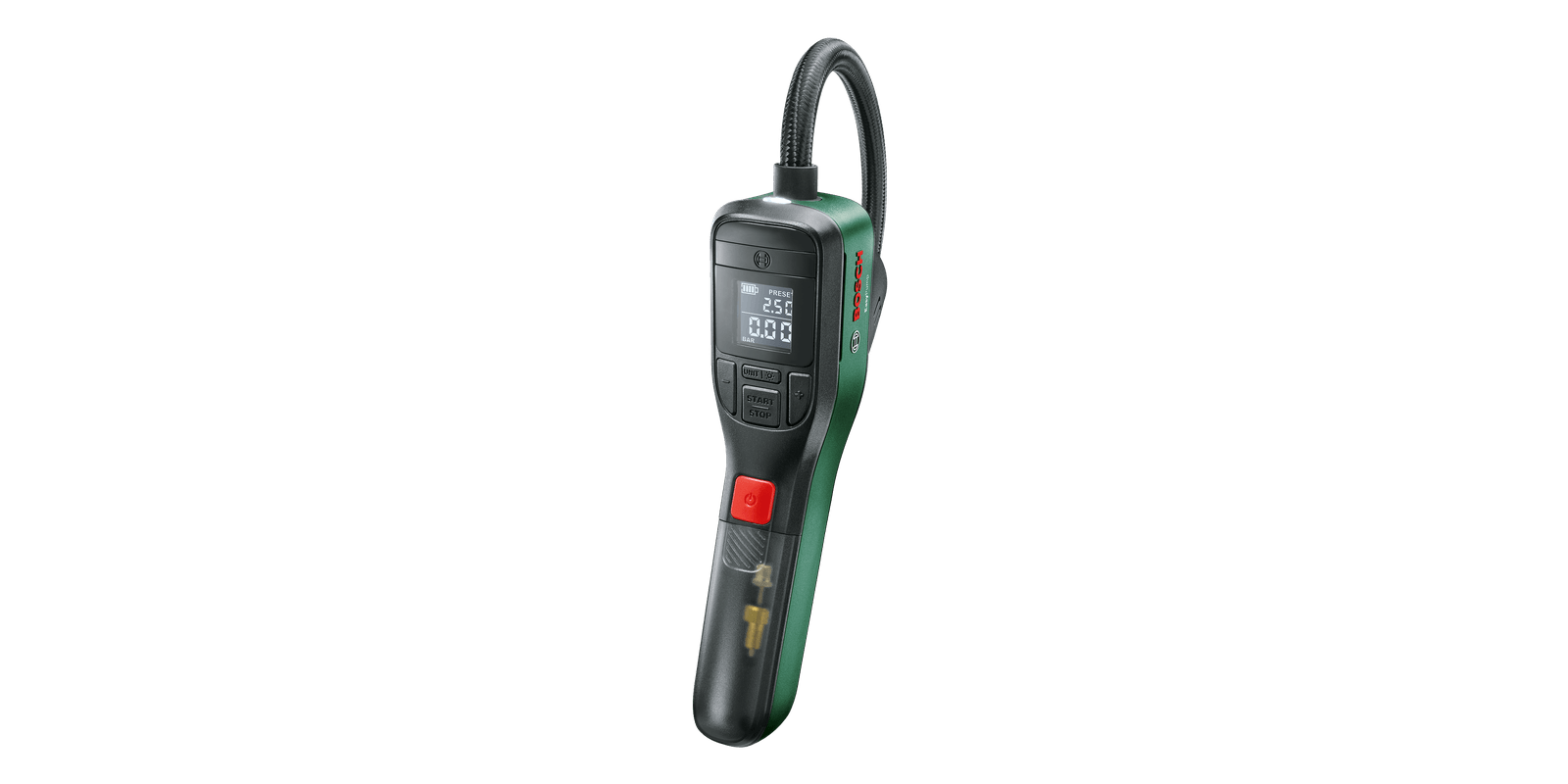 - Nagy teljesítmény és precizitás: A Bosch EasyPump akár 10,3 bar (150 psi) nyomásra is képes, valós idejű méréssel. A gyári beállításoknak köszönhetően sosem kell aggódnia a túlfújás miatt.