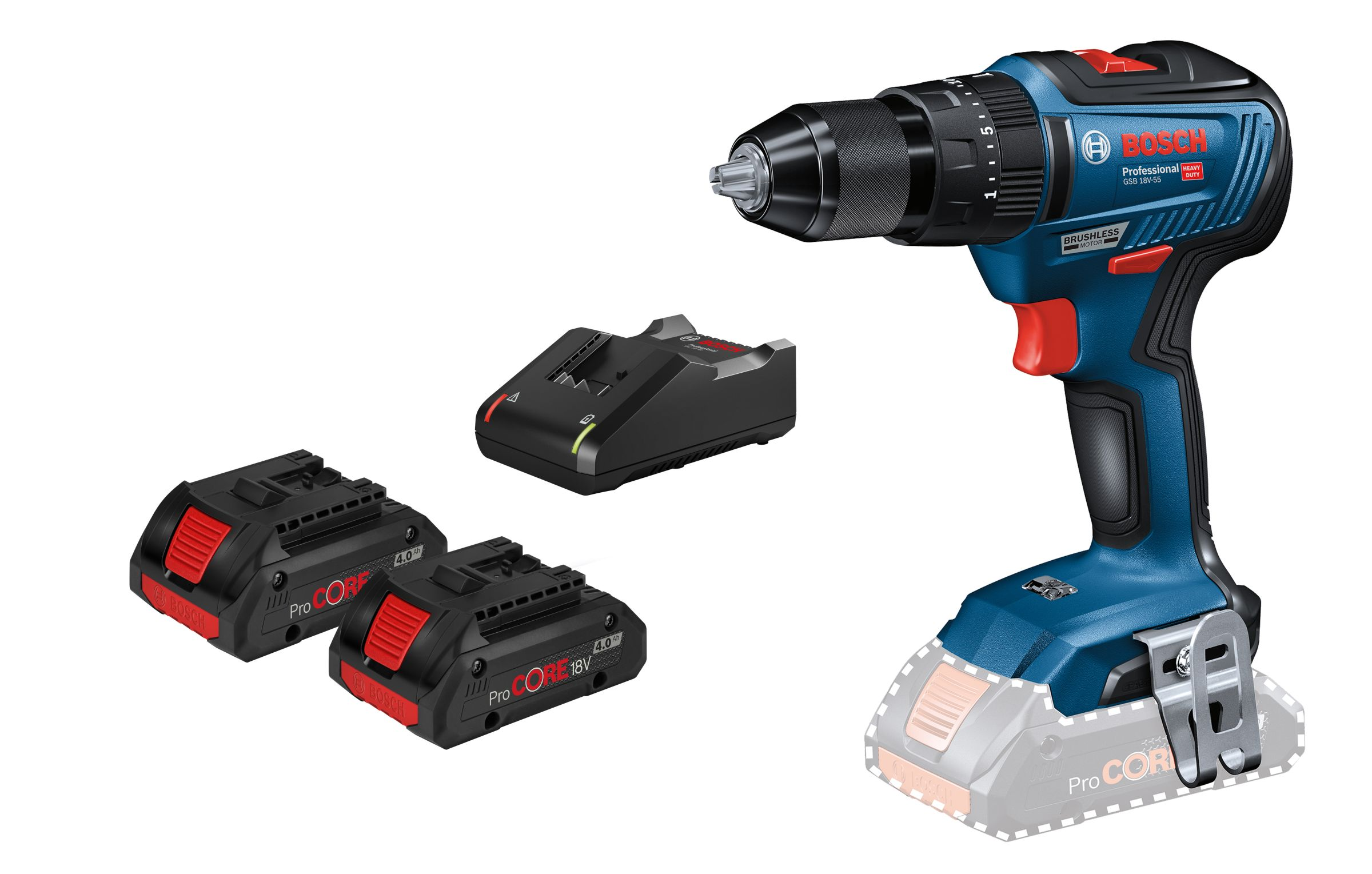 A Bosch GSB 18V-55 Professional akkus kalapácsfúró kefe nélküli EC motorjának köszönhetően kiváló minőségű és hosszú élettartamot kínál. A nagy, 55 Nm nyomatékkal és 1750 1 / min fordulatszámmal maximális hatékonyságot kínál a munkahelyen, különösen fa, fém és falazat munkálatai során. A Roehm robusztus, 13 mm-es fémfúrótokmánya ideális erőátvitelt kínál különböző fúrási, ütőfúrási és csavarozási munkákhoz. A GSB 18V-55 Professional kefe nélküli motorja hosszú élettartamot és hosszabb akkumulátor-üzemidőt biztosít. A készülék alkalmas fa, acél és falazat fúrására és kalapácsfúrására. A GSB 18V-55 Professional rendelkezik egy praktikus övcsipesszel is, amellyel kényelmesen felakaszthatja az akkus csavarhúzót az övre vagy a létrára. Ez az ajánlat két ProCORE18V 4.0Ah akkumulátort tartalmaz, amelyek a legújabb cellatechnológiának köszönhetően ugyanolyan teljesítményt tudnak nyújtani, mint a 4Ah szabványos akkumulátorok, de lényegesen kisebb méretekkel, alacsonyabb tömeggel és 135% -kal hosszabb élettartammal, mint egy szokásos akkumulátor - a COOLPACK 2.0-nak köszönhetően - Technológia, amely megakadályozza az akkumulátor túlmelegedését. A rugalmas áramellátó rendszer 100% -ban kompatibilis az összes új és meglévő Bosch Professional 18 voltos elektromos eszközzel és töltővel.