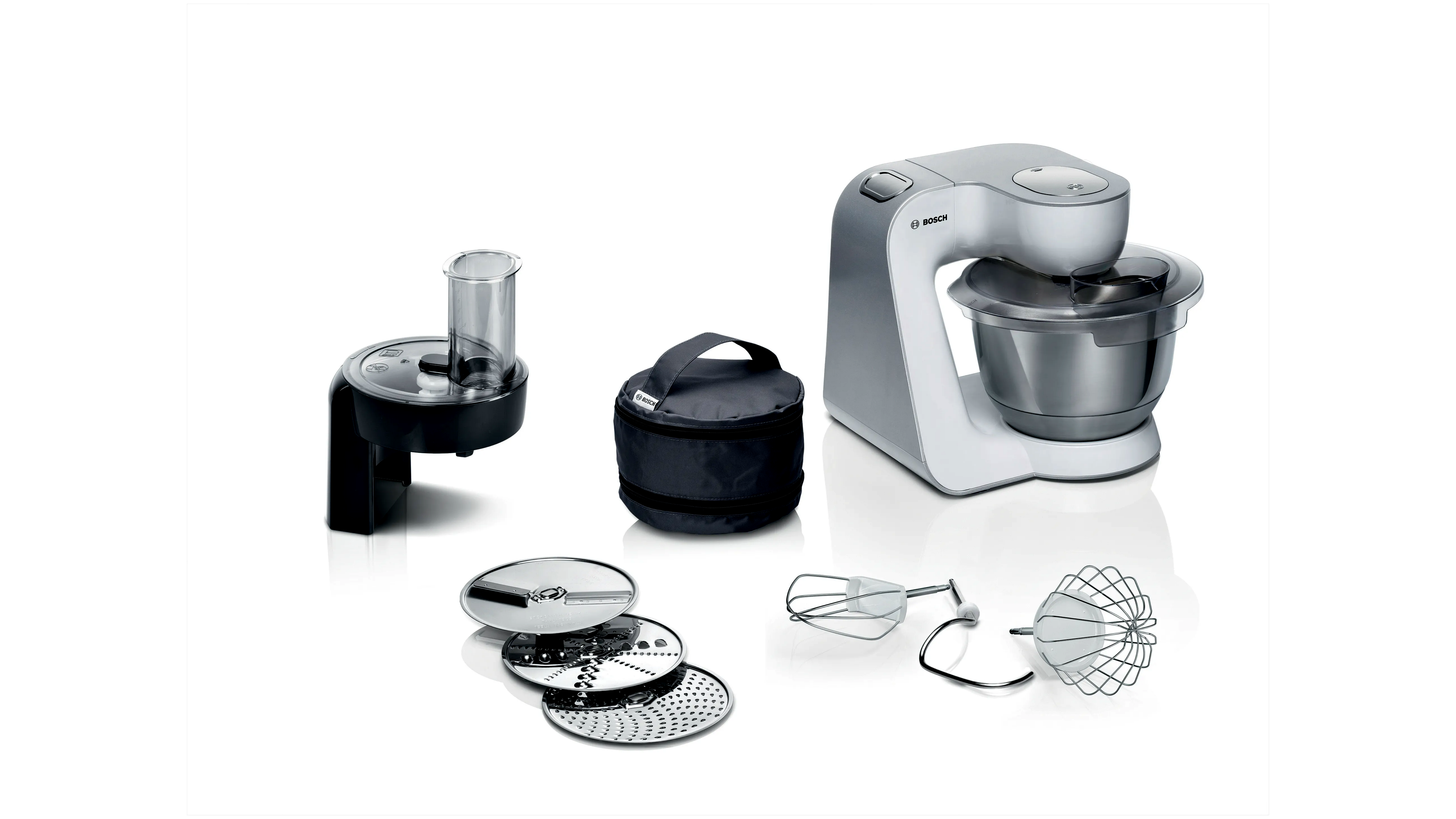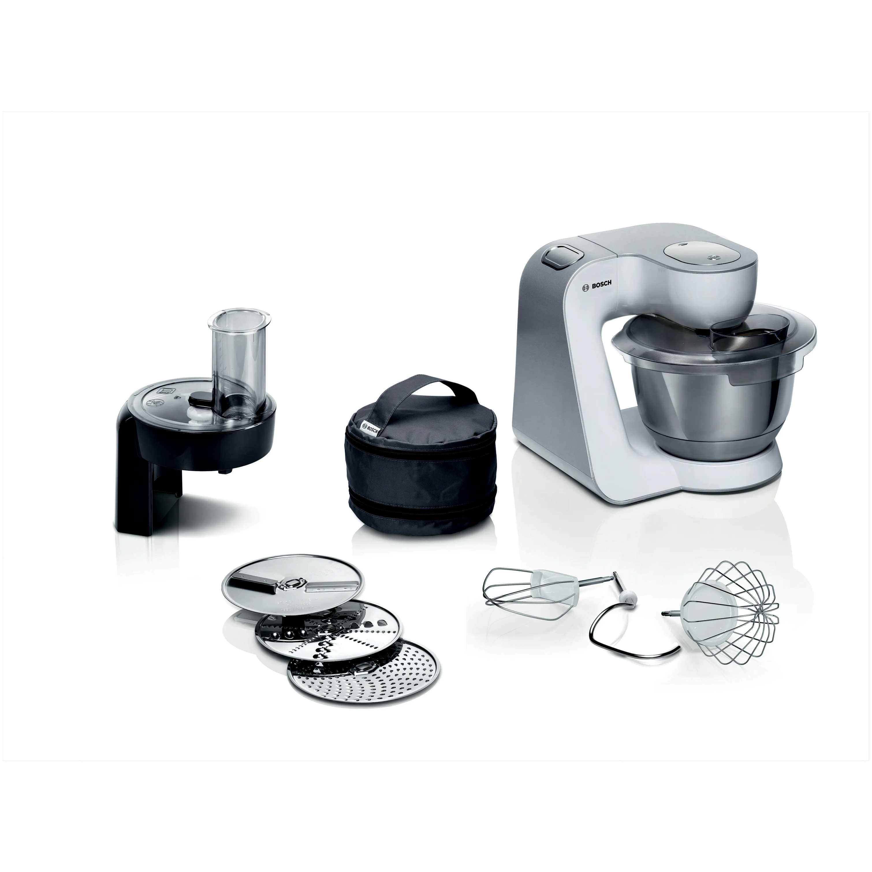 1 x Fedél, 1 x Szeletelőfeltét, 1 x Nemesacél keverőtál, 1 x Fém dagasztóbetét, 1 x Megfordítható reszelőkorong, 1 x Reszelőkorong (középfinom), 1 x Keverőbetét, 1 x Habverő betét, 1 x Megfordítható szeletelőkorong
