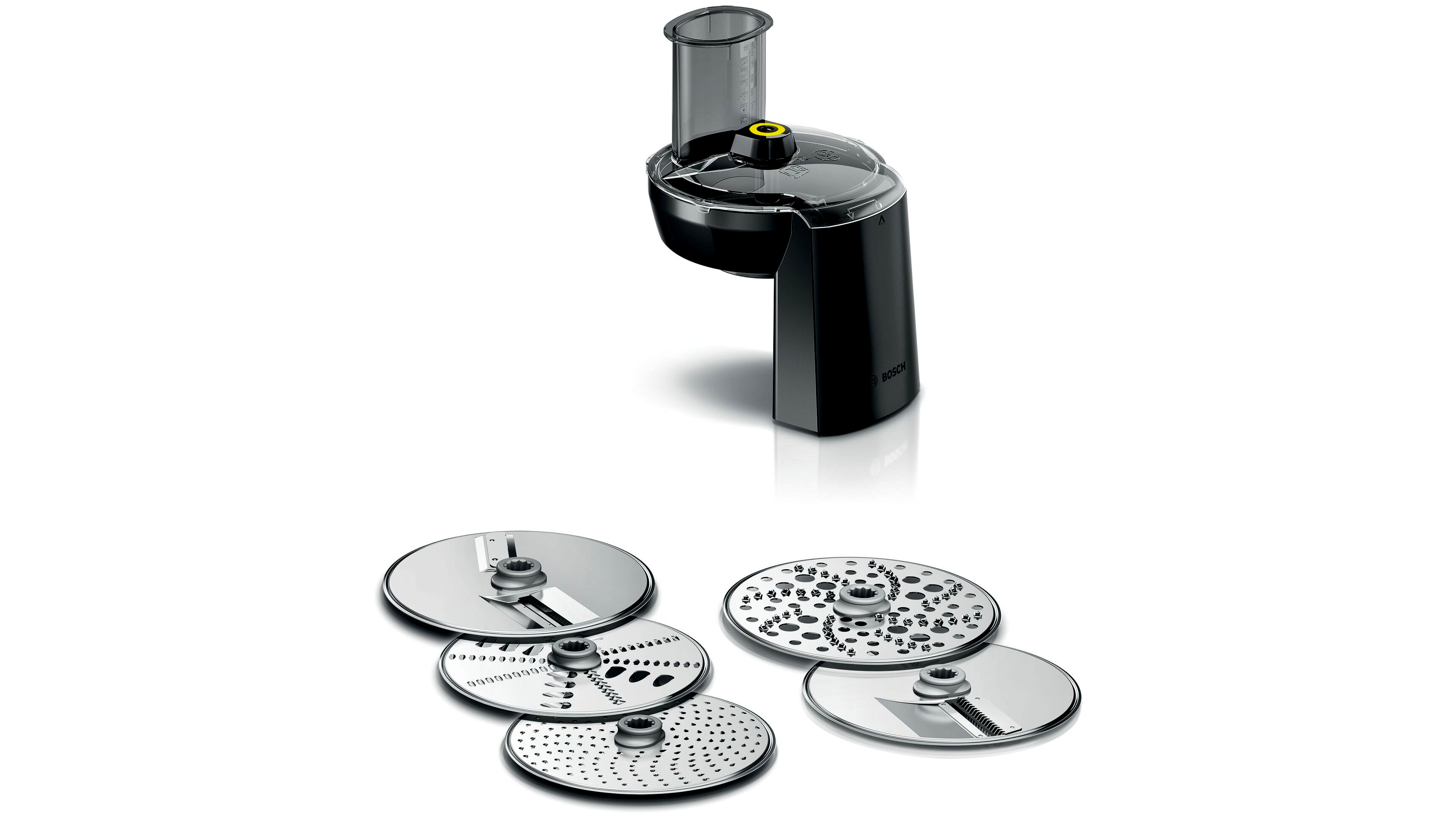 Folyamatos szeletelő és öt különböző tárcsa: a különböző összetevők gyors és egyszerű feldolgozásához.