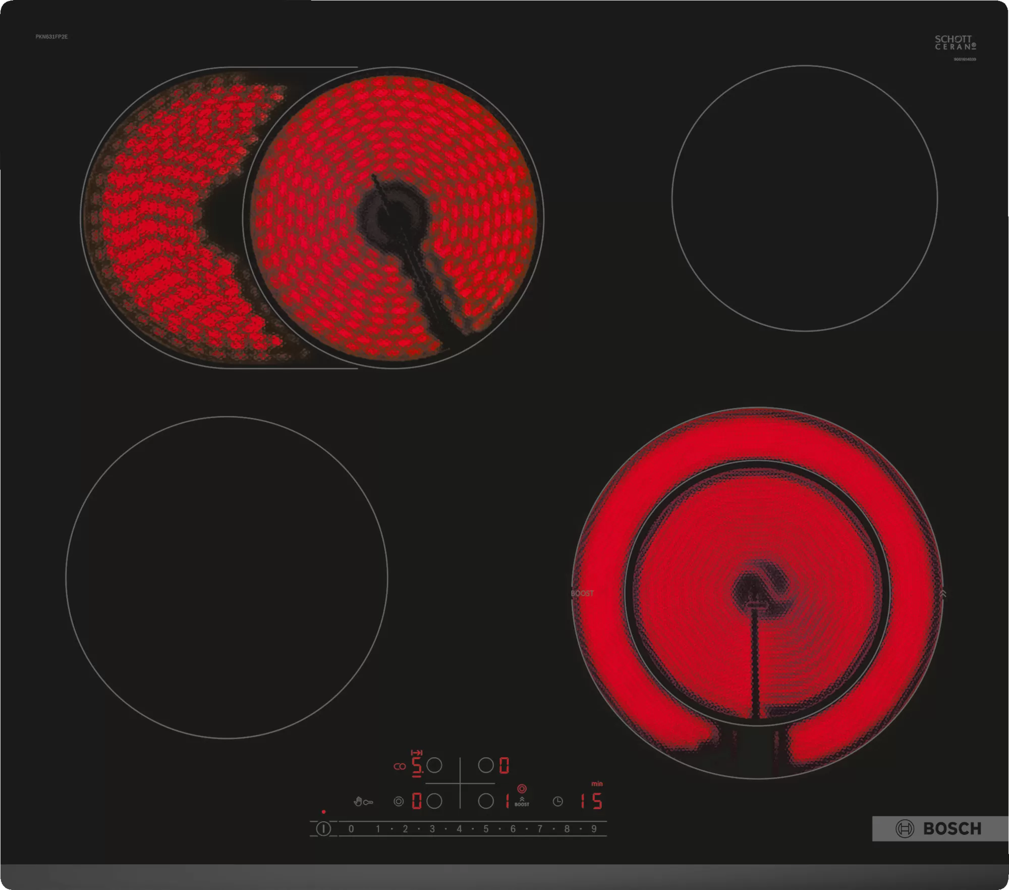 2 fokozatú maradékhő jelző megmutatja, hogy mely főzőzónák még forrók vagy melegek.