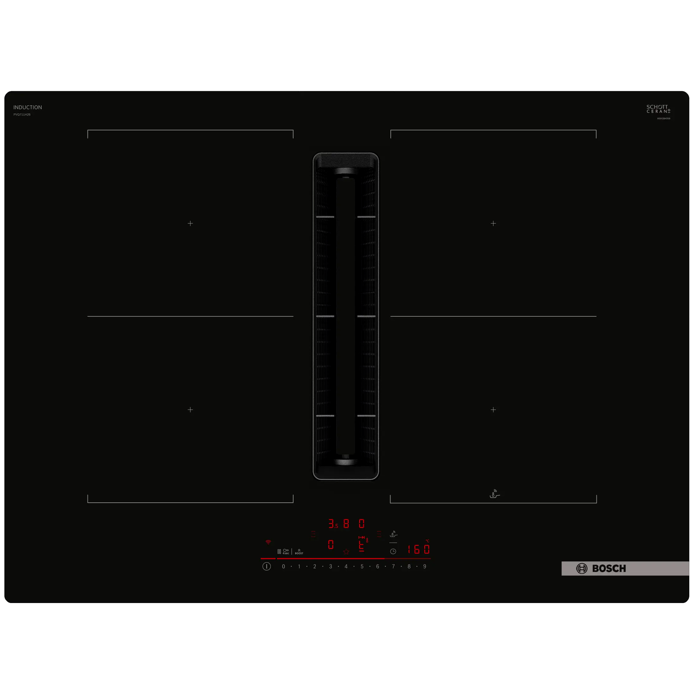 A Bosch beépíthető indukciós főzőlap beépített páraelszívóval ideális választás azoknak, akik letisztult, szellős konyhai megjelenésre vágynak felső szekrény fölé szerelt kürtő nélkül. A főzőzónák és az erős, központi elszívás tökéletesen együtt dolgoznak: a gőz és a szag már a keletkezés helyén kerül elszívásra, miközben a teljes főzőfelület gyorsan és energiatakarékosan működik.