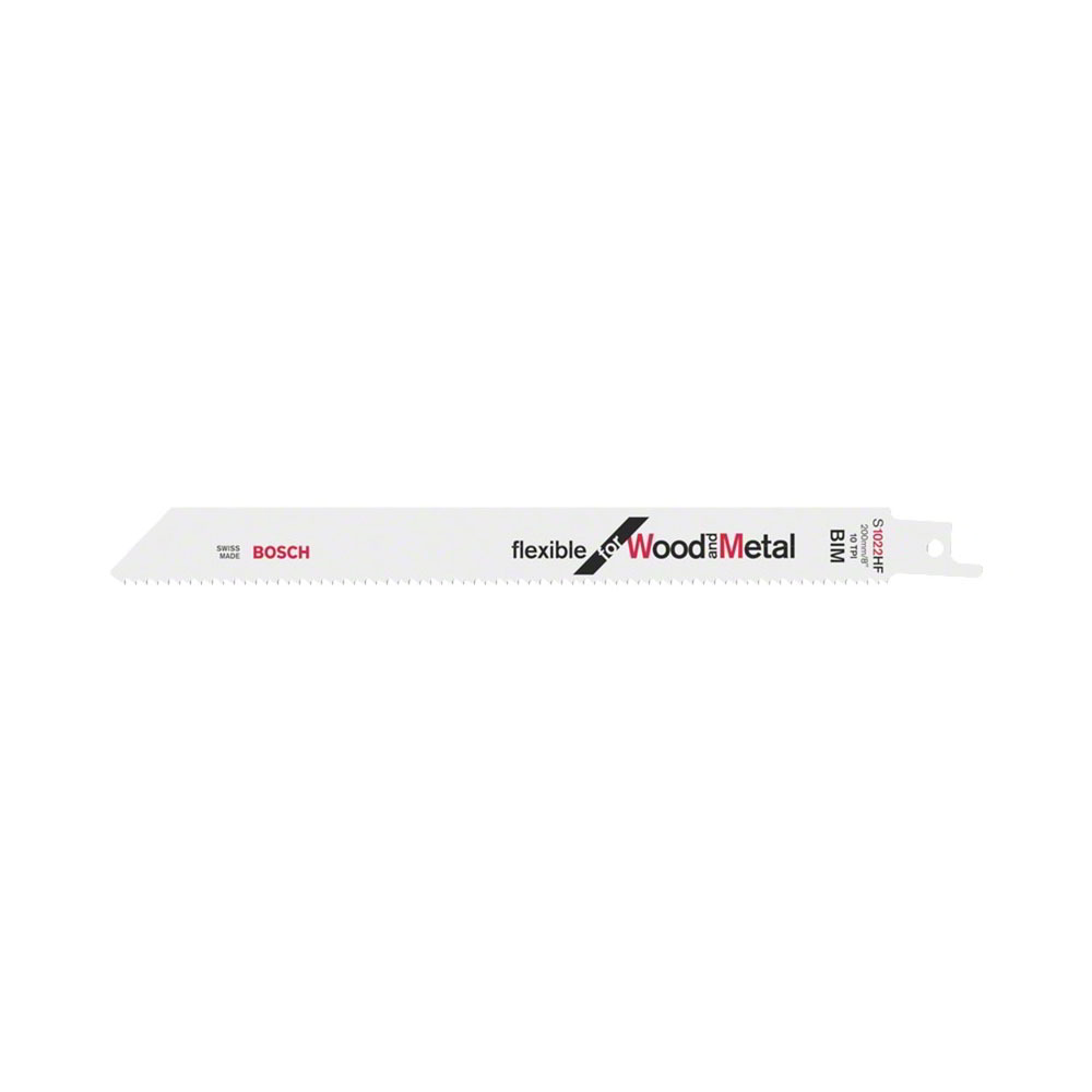 A Bosch S 1022 HF Flexible for Wood and Metal szablyafűrészlapja fa és fém síkban történő vágására alkalmas. A bimetál talp kombinálja a HCS (magas széntartalmú acél) lapot egy HSS (nagysebességű acél) fogsorral, így a szablyafűrészlap ideális a raklapok megmunkálásához. A közepes fogosztás lágy szögeket és kötőelemeket is vág, amelyeket gyakran használnak raklapszerkezeteknél. Az S 1022 HF Flexible for Wood and Metal kompatibilis az 1/2" univerzális szárrögzítéssel rendelkező szablyafűrészekkel / reciprofűrészekkel.