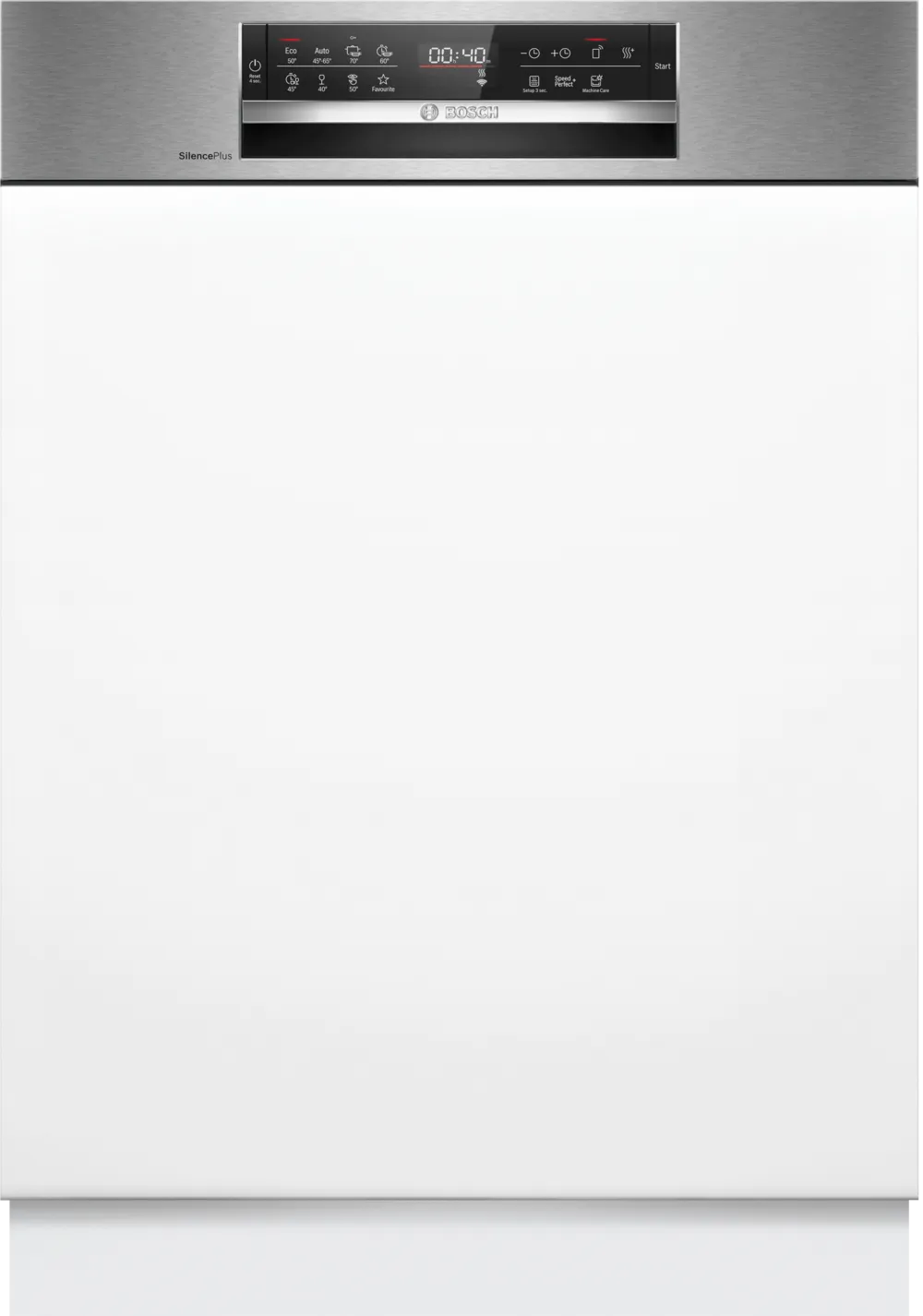 A Bosch SMI6ECS12E mosogatógép Home Connect képes WiFi-n, így okostelefonjáról is irányítható. A TouchControl kezelőpanel és az angol nyelvű kijelző könnyűvé teszi a használatát. Az elektronikus maradékidő kijelzés, programfutás kijelző és az időprogramozás (1-24 óra között) további kényelmet biztosítanak.