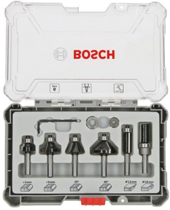 A Bosch 2607017469 marófejkészlete számos alkalmazásban alkalmas a finom megmunkálásra, és tökéletes választás mindazok számára, akik fával dolgoznak, például ácsok, asztalosok, belsőépítészek és más építőipari mesteremberek számára. A marók keményfém vágóélei hosszú élettartamot biztosítanak, és a különböző marógeometriákkal számos profil vágható különböző anyagokba. A marófejek puhafa, keményfa és kompozit faanyagok megmunkálásához készültek, és minden 8 mm-es szárral rendelkező szabványos kézi marógéphez alkalmasak. A tartályban egy speciális "Easy-Pick" betét található, amely lehetővé teszi a vágókések gyors és biztonságos eltávolítását a szárból. Az exkluzív és rendkívül robusztus dobozban a vágógépek szilárdan és biztonságosan vannak elhelyezve, és a tartalmat tökéletesen védik a tárolás és a szállítás során. A tartalom az átlátszó fedélen keresztül mindig látható. A 6 darabos marókészlet élmegmunkáló marókat tartalmaz süllyesztett maráshoz, ferdítéshez és lekerekítéshez, valamint pótalkatrészeket, két golyóscsapágyat és egy imbuszkulcsot.