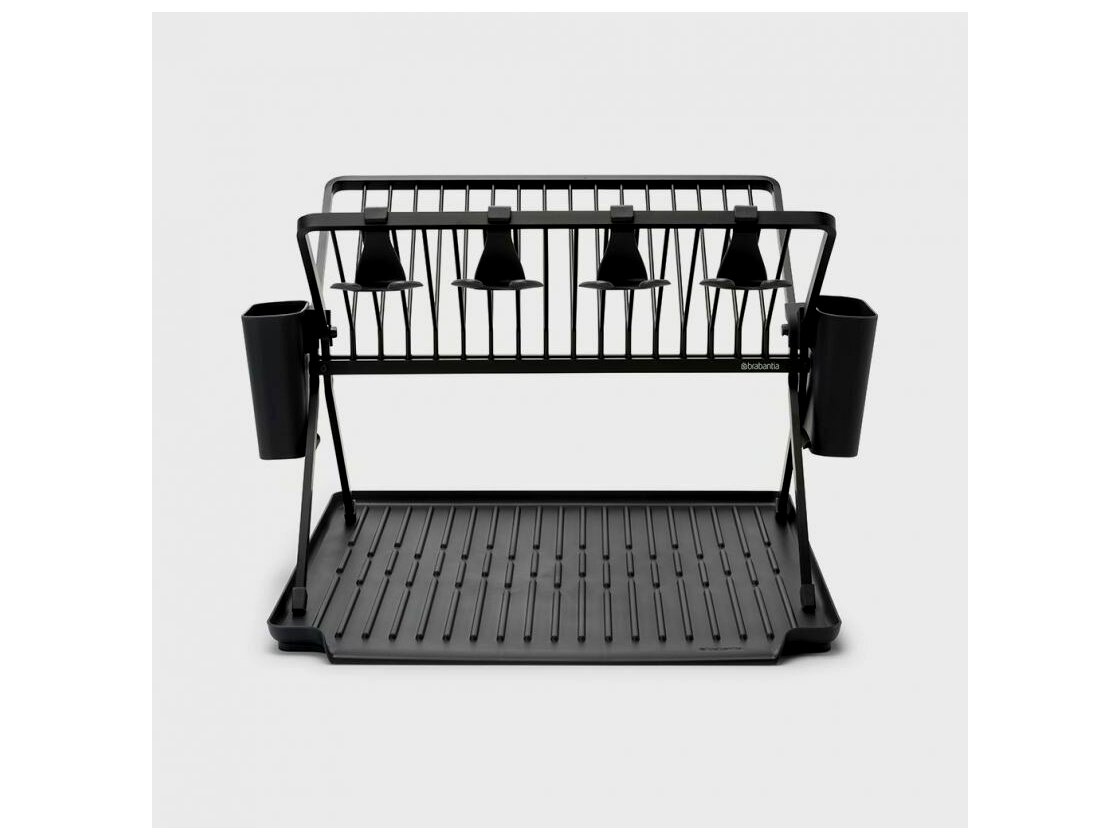 Akár 17 tányér is elfér benne, és 4 borospohárnak is van akasztható helye. Az evőeszközök szárítására szolgáló két kosár kivehető, így az állvány könnyen összecsukható.