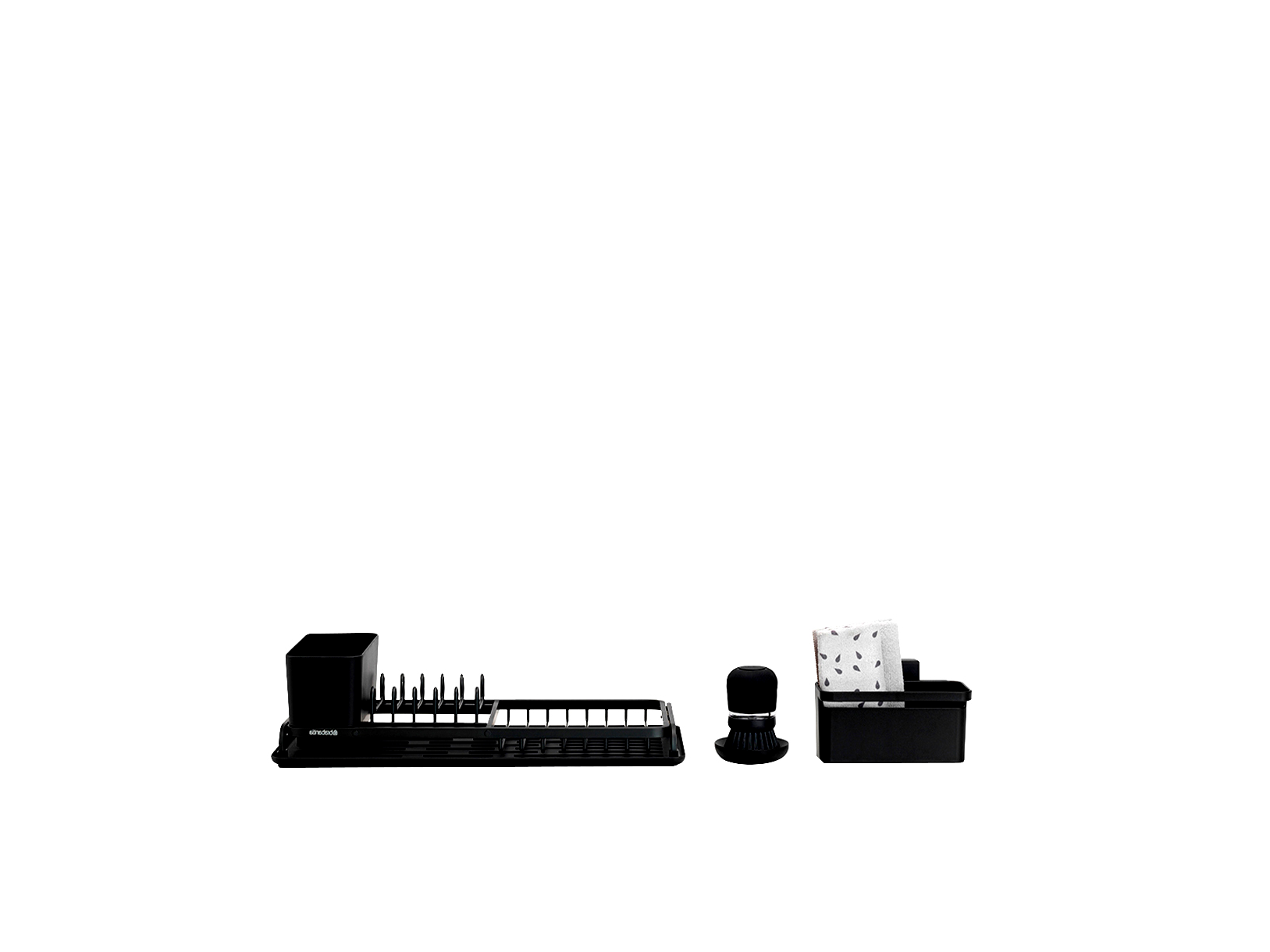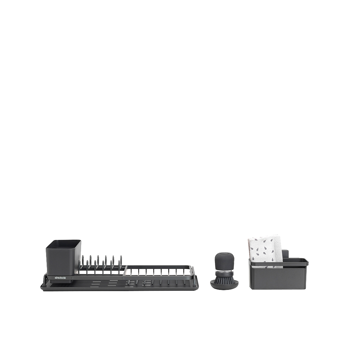 A mosogatószett Brabantia tartalmaz egy kompakt edényszárító állványt, mosogatószervezőt, mosogatókefét és egy törlőrongyot.