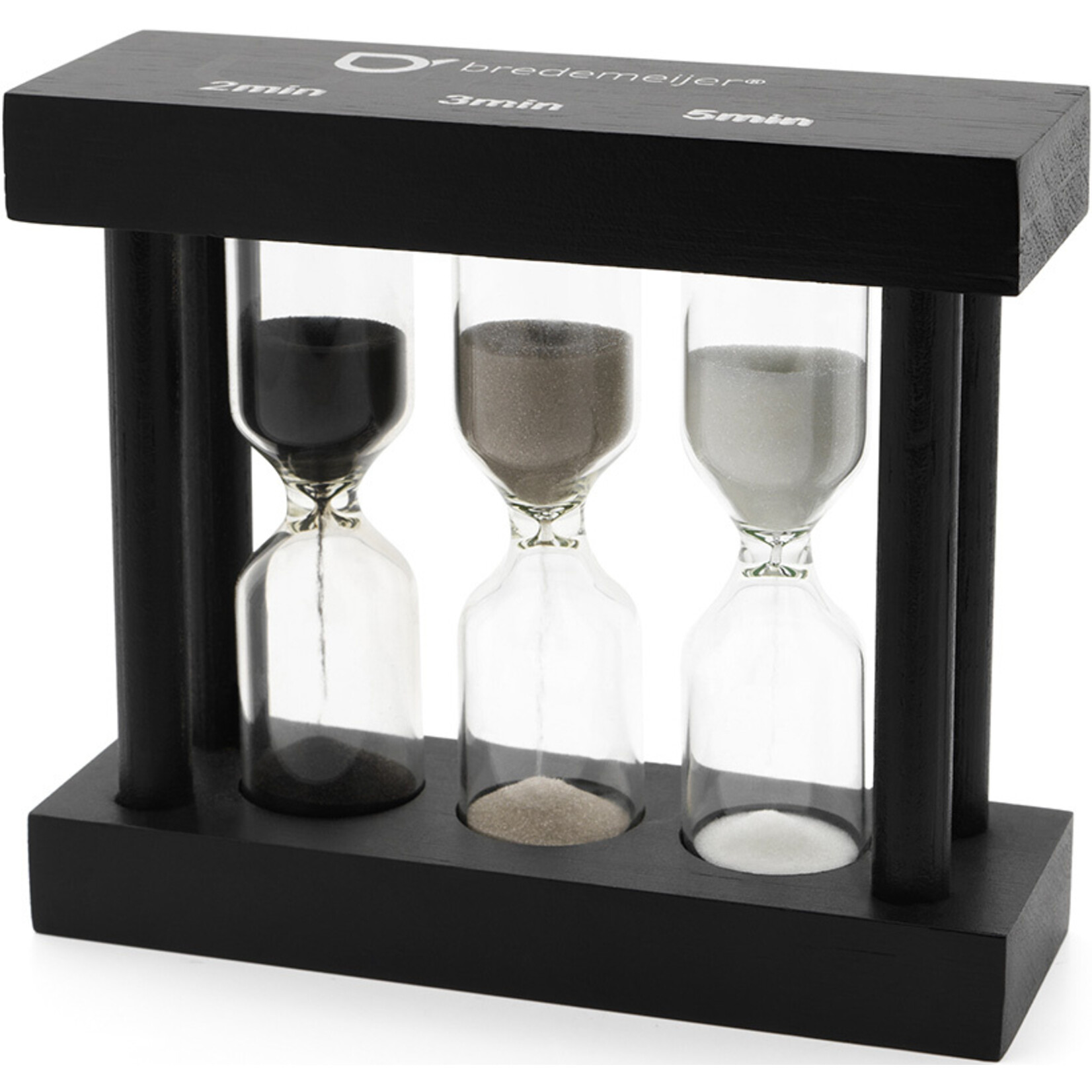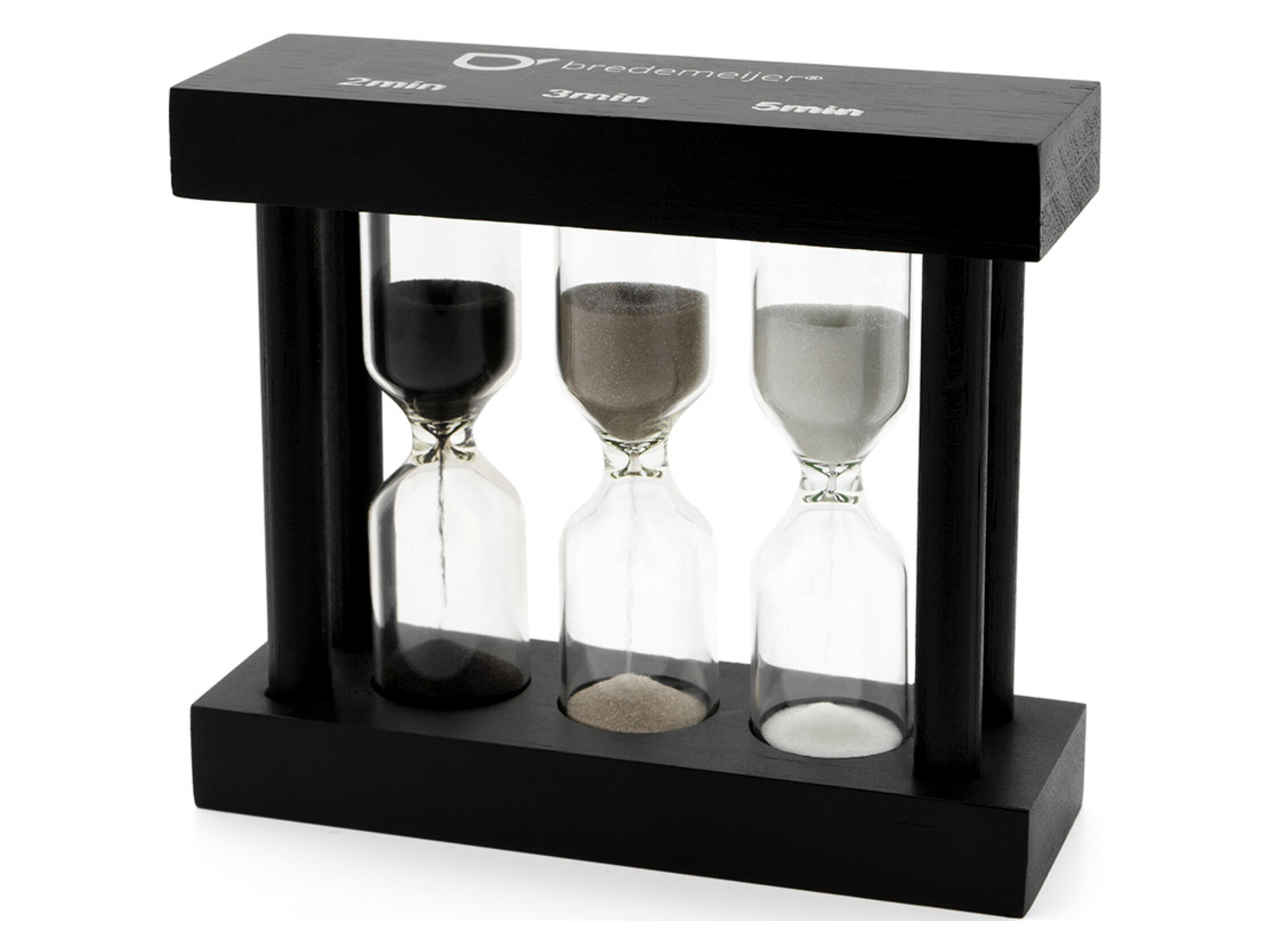 A tea időzítő három homokórából áll, amelyeket egy szép fekete bambuszkeret foglal magában. Mindegyik homokóra különböző ideig tartó főzési időket kínál: 2, 3 és 5 perc, így lehetősége van a különböző típusú teák optimális főzési idejét kiválasztani.