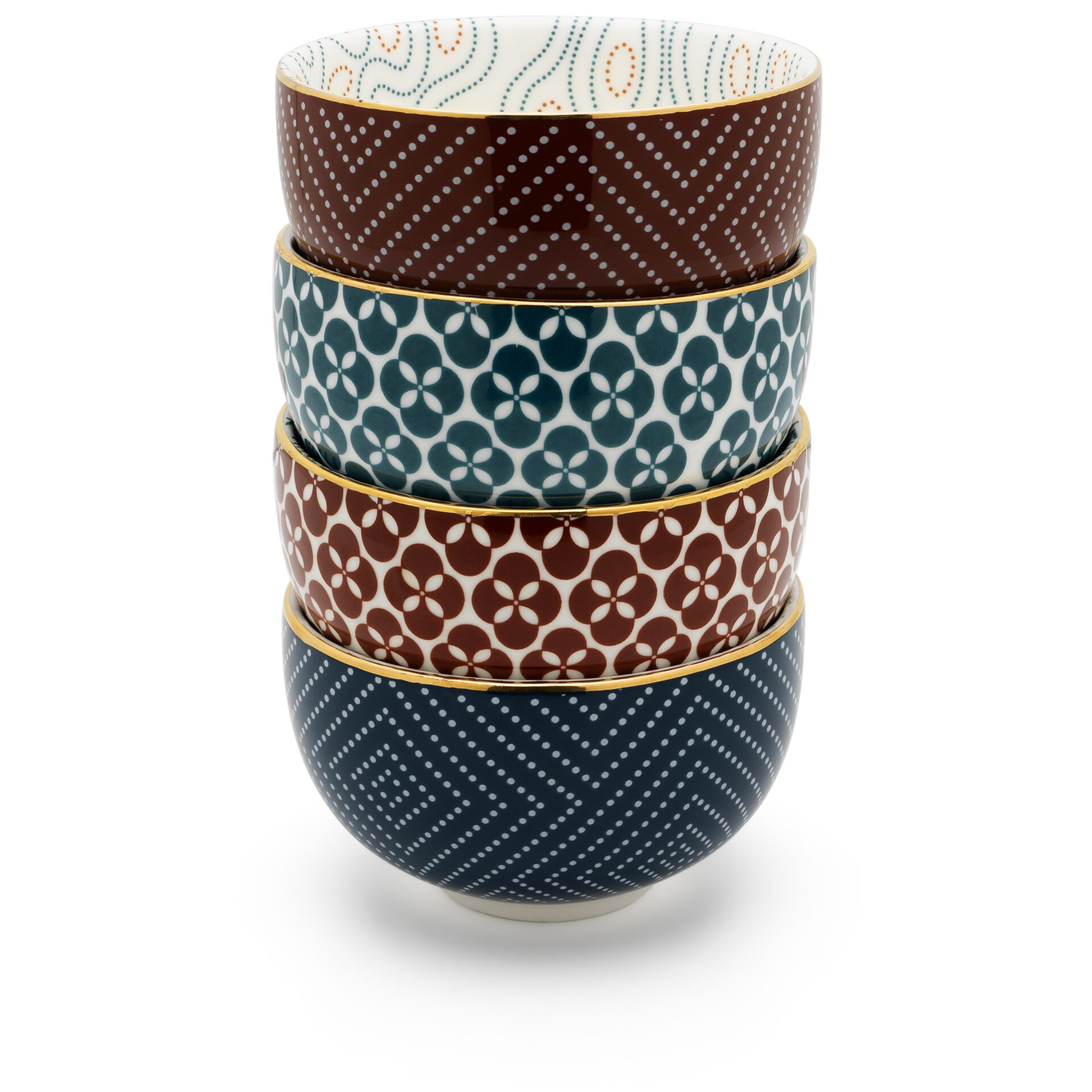 Élvezze a teázás művészetét a Bredemeijer Pucheng 200ml Teáscsészékkel, melyek az elegancia és a funkcionalitás tökéletes kombinációját kínálják. Ez a szett négy gyönyörű teáscsészéből áll, amelyek különböző motívumokkal és színekben pompáznak: benzin, rozsdavörös és fehér. Mindegyik csésze kívül-belül díszített, elegáns arany peremmel a tetején.
