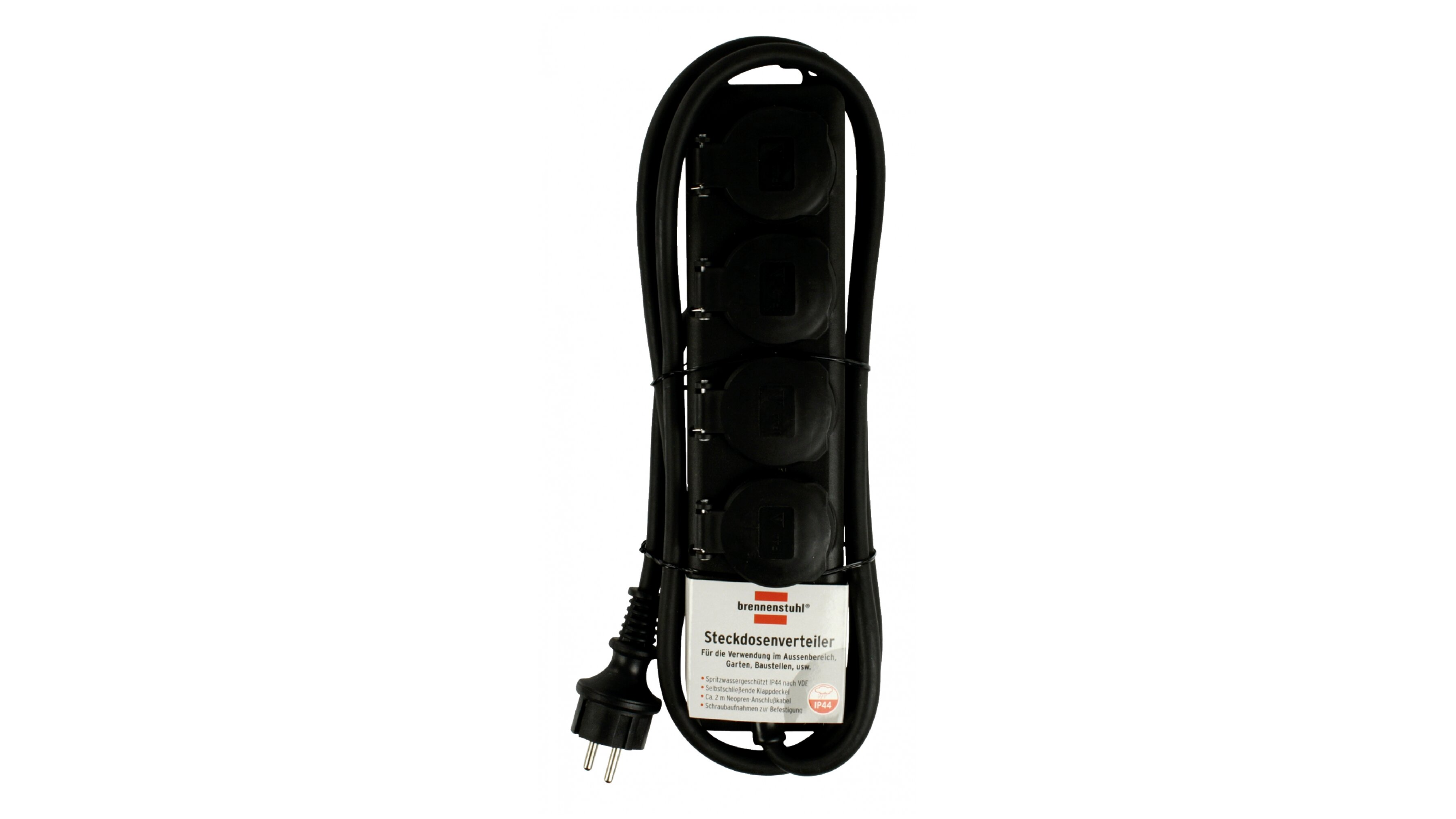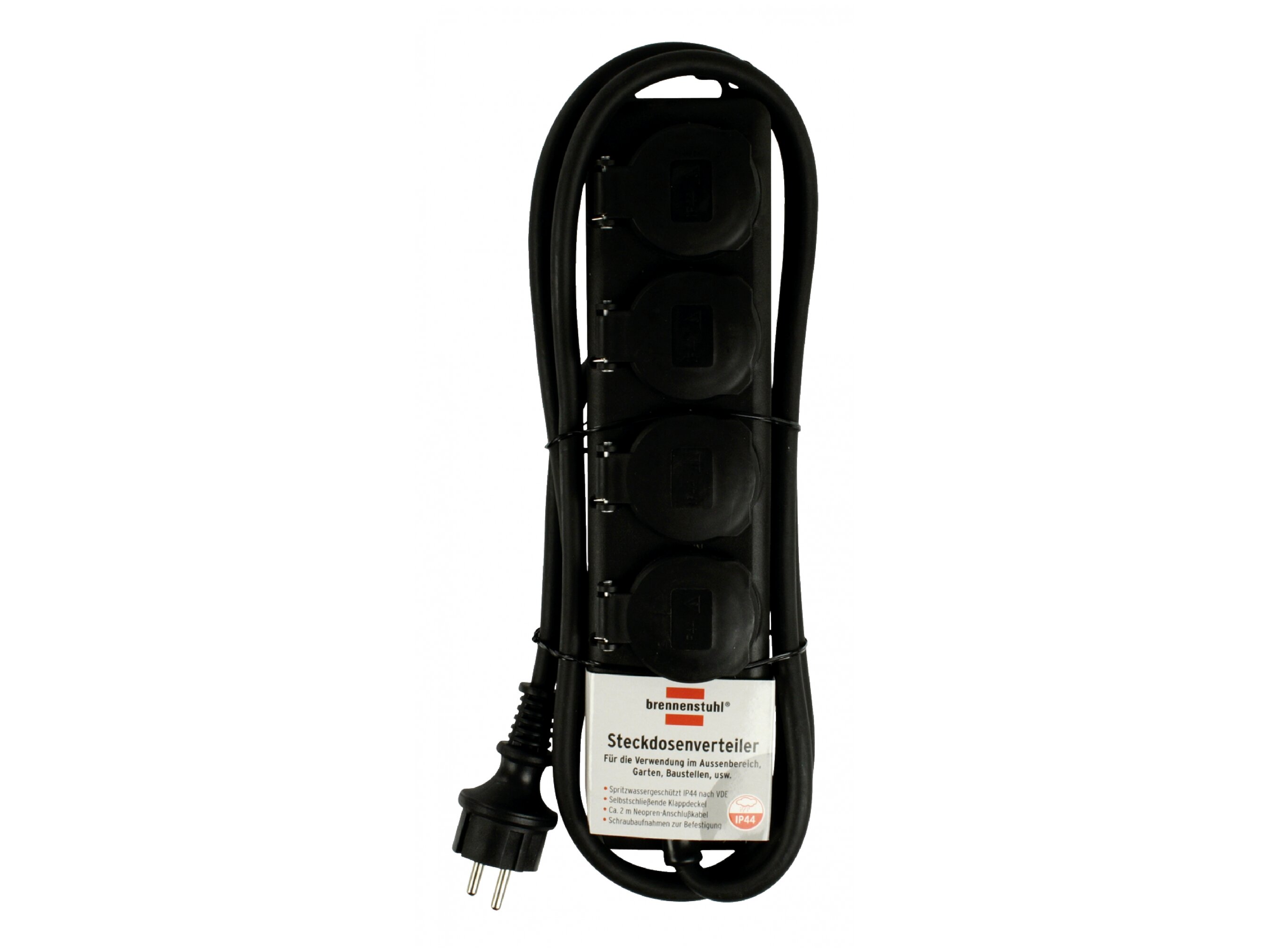 Univerzális, kültéri használatra is alkalmas, vízspriccelés védelemmel ellátott elosztó. IP 44 VDE szabvány szerint.