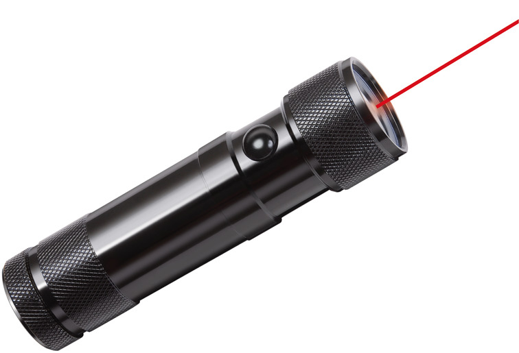 - Könnyen lenyomható kétfunkciós kapcsoló: 1. LED-ek be, 2. lézermutató be.