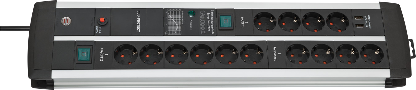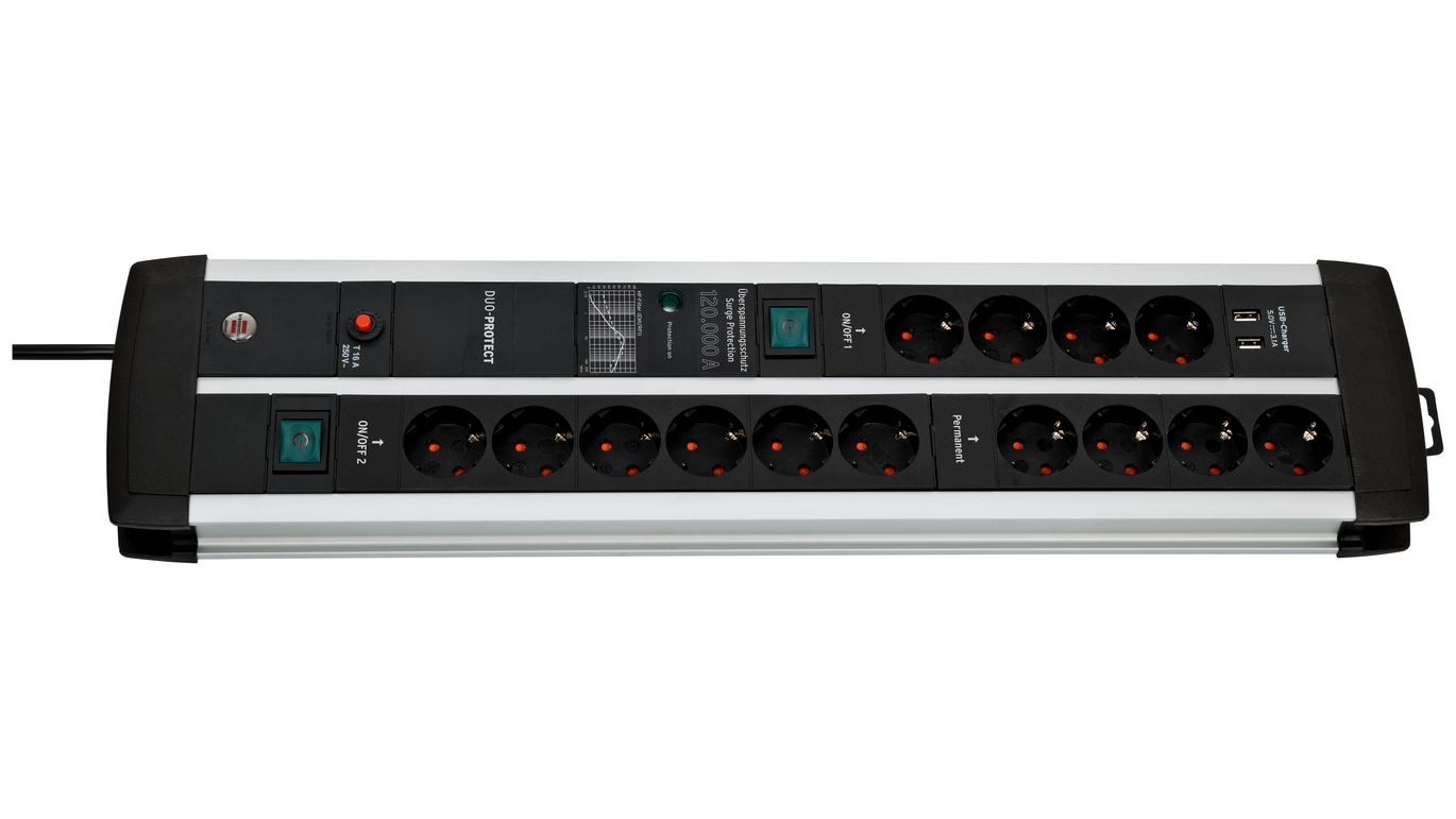 - 14 aljzatos védőérintkezős túlfeszültség védő elosztó 3 méter hosszú kábellel (H05VV-F 3G1.5) és megnövelt érintésvédelemmel - ideális a fogyasztói elektronika (TV rendszer, PC, játékkonzol stb.) biztosításához.