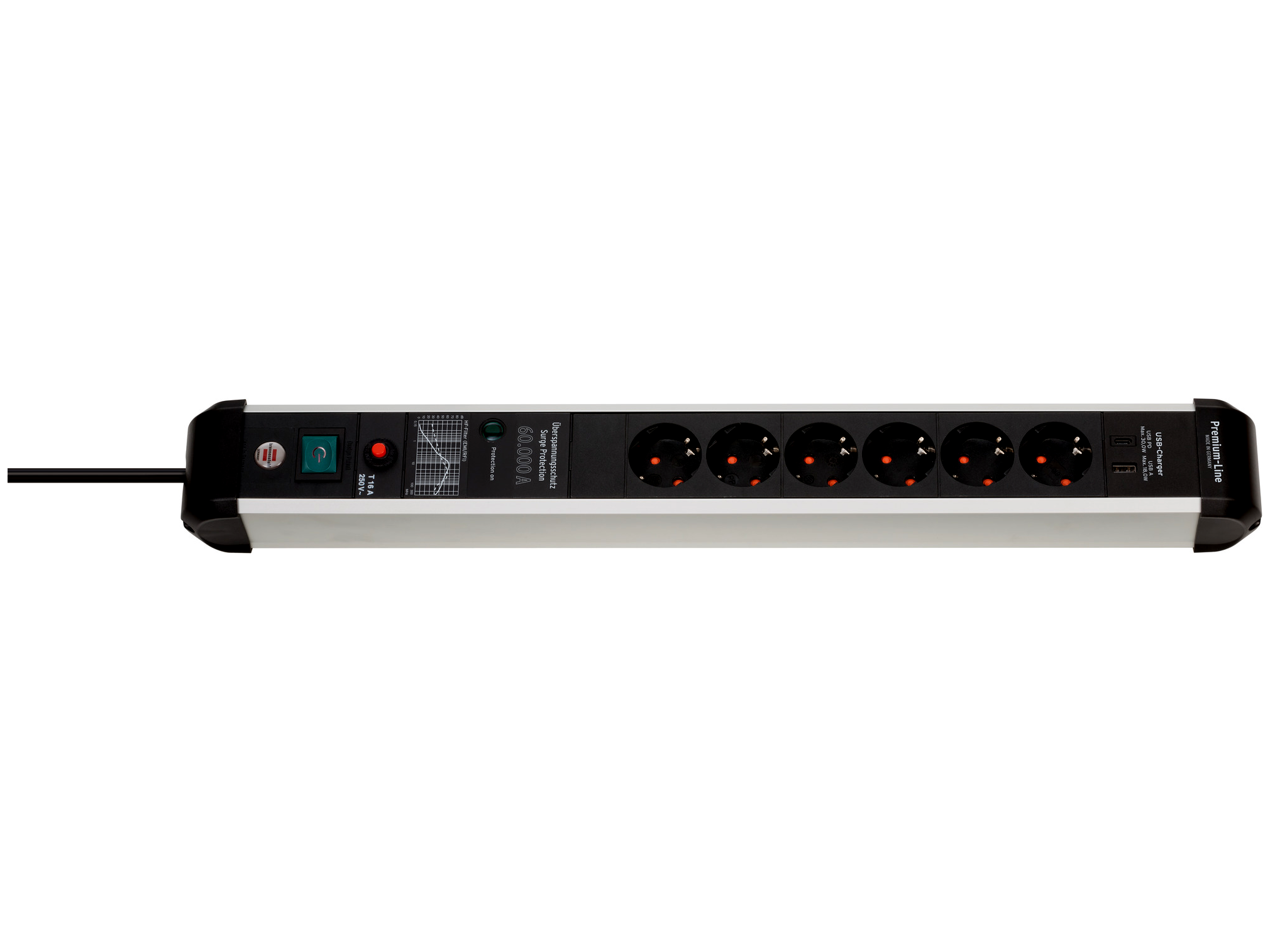 - 6 aljzatos elosztó USB töltőaljzatokkal - 1x USB-C 30W töltő (gyorstöltéshez) és 1x USB-A 18W, 3m kábelhossz (H05VV-F 3G1.5) és 60000A túlfeszültségvédelem.