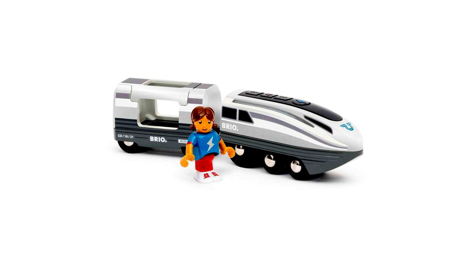Pörgesd fel a sebességet a Turbóvonattal! Egyszerűen nyomd meg a nagy turbó gombot, és ez az elemmel működő játékvonat megduplázza a sebességét, így a BRIO World leggyorsabb vonatává válik.