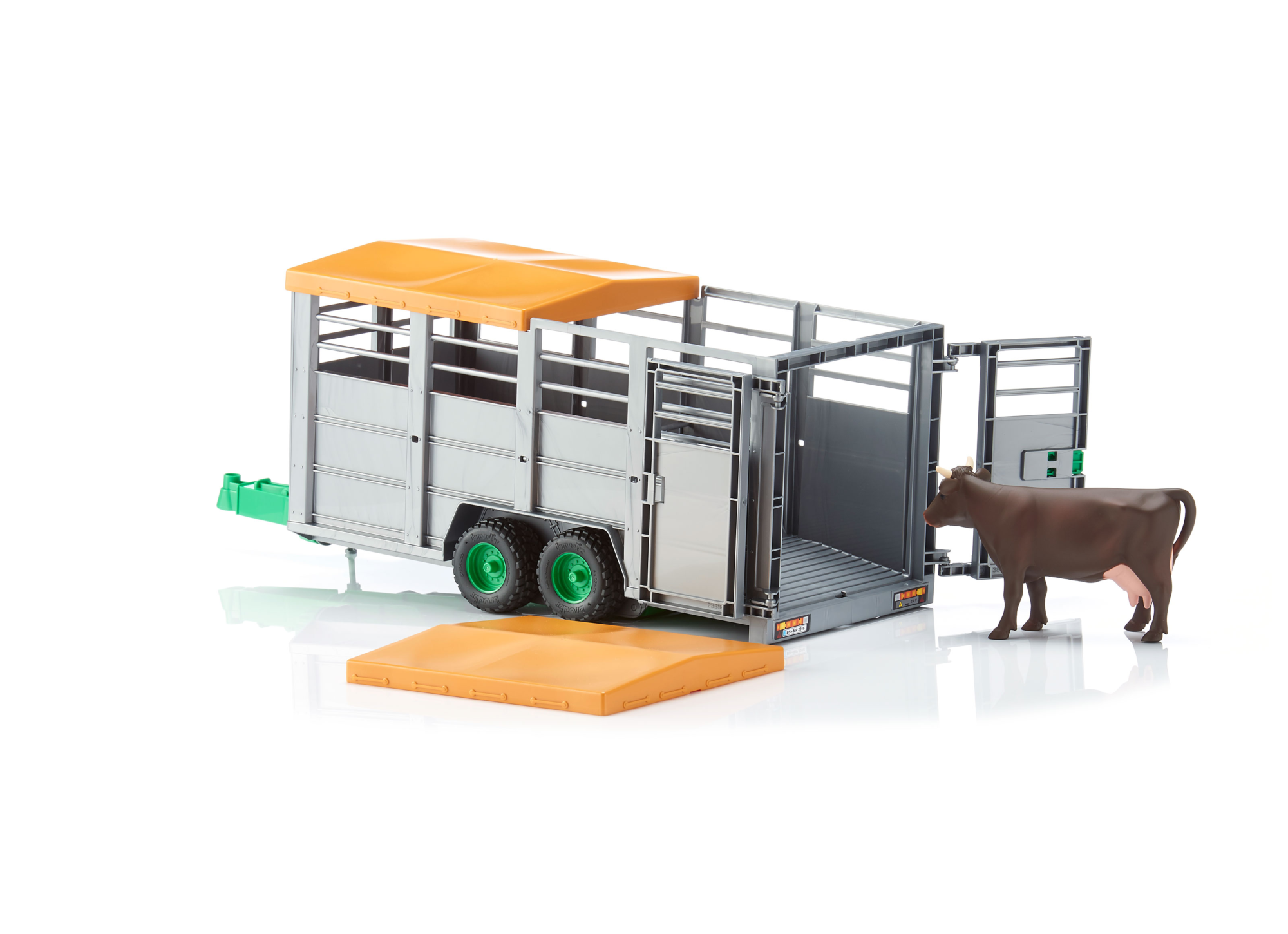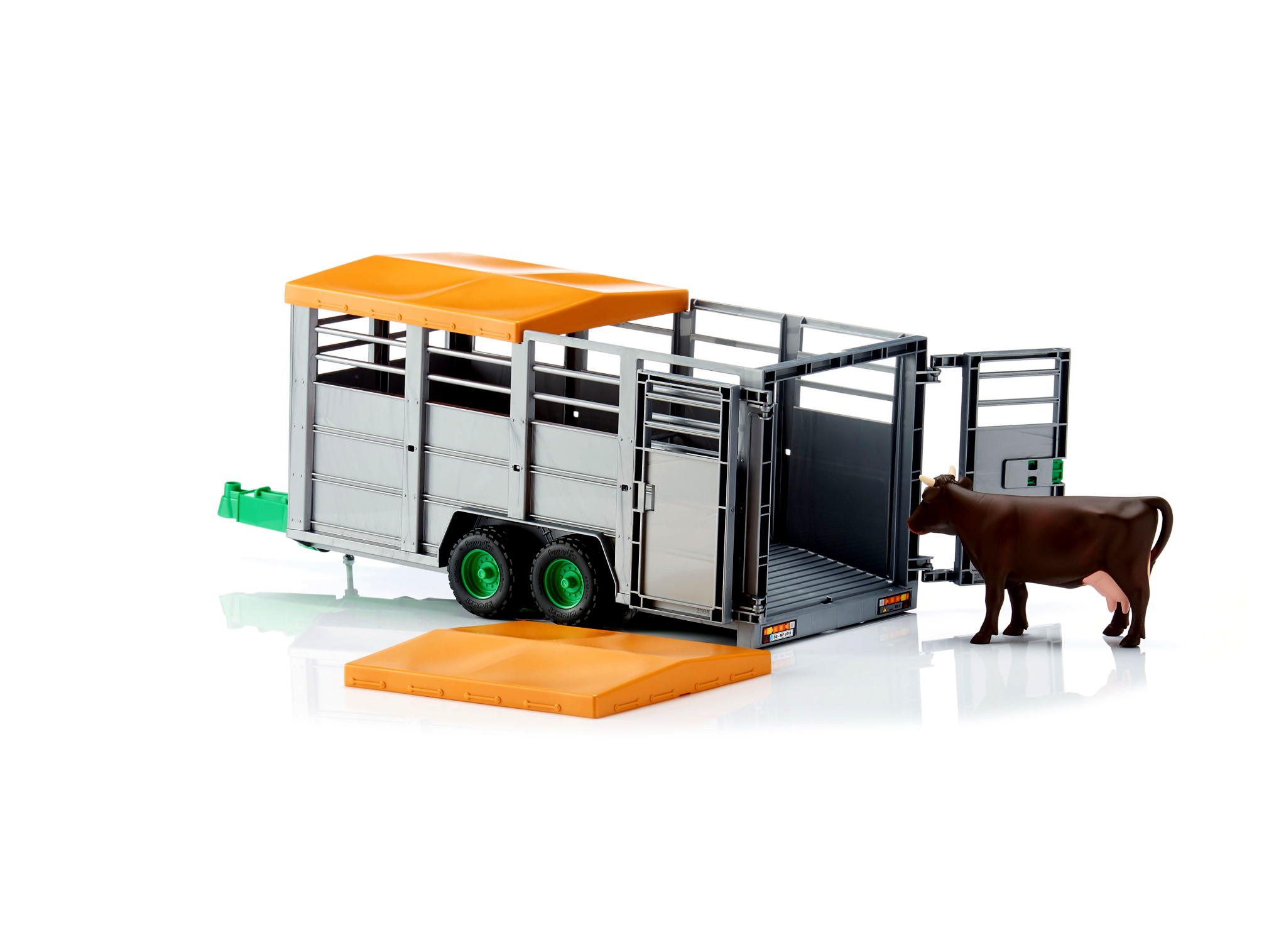 Tavasszal sok szarvasmarha-állományt visznek a legelőkre, ahol a nyarat töltik. Ebből a célból a gazdálkodóknak speciális szarvasmarha pótkocsikra van szükségük az állatok megfelelő szállítási feltételeinek biztosítása érdekében. Ez a sokoldalú szarvasmarha-pótkocsi már hozzá lett adva a BRUDER termékcsaládhoz. Csakúgy, mint az eredeti, a modell 1:16-as skálán csökkentheti platformját, hogy megkönnyítse az állatok betöltését, és kaput tartalmaz. A ponyvát és az ajtókat könnyű kinyitni, és a pótkocsi kompatibilis az összes vontatóval és járművel, amelyek standard pótkocsival vannak ellátva. Az egyik tehén már szerepel a szállítási terjedelemben, a pótkocsi összesen hat állat számára biztosít helyet a tartozékkínálatunkból (2308, 2309 és 2306).