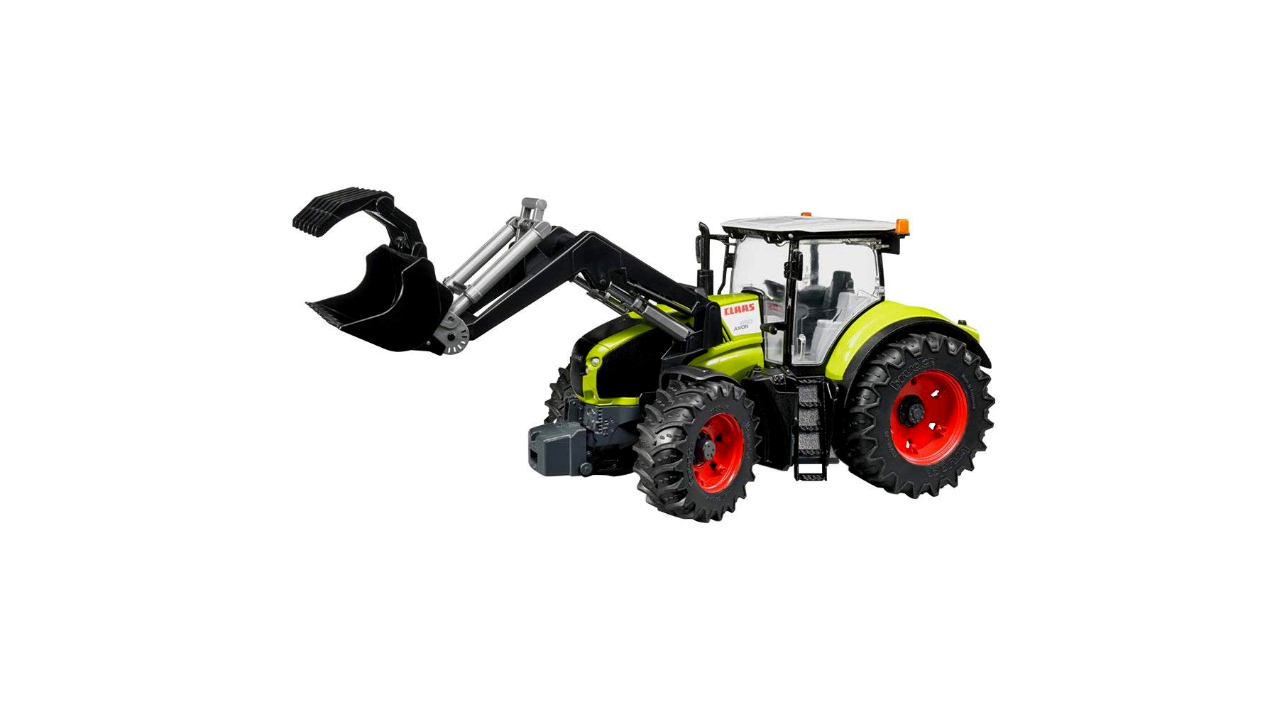 A Claas Axion 950, amely itt egy csúszós homlokrakodóval van felszerelve, a traktor gyártójának legújabb és innovatív modellje. Ezt a legmagasabb szintű modellt a hosszú tengelytáv, a kiváló súlyeloszlás és a működtetés ugyanolyan kényelmes, mint még soha - ez a modell 1:16-os skálával rendelkezik. A vezetőfülke teljesen üvegezett és könnyen nyitott ajtókkal rendelkezik. Az összecsukható motorháztető a lenyűgöző motort mutatja. Kiváló kezelhetőség és kényelem a beépített oszcilláló tengelynek köszönhetően, valamint a kormánykerék hosszabbítója, amely a tetőn keresztül van behelyezve. A magasságban állítható hátsó tengelykapcsoló kompatibilis minden professzionális sorozatú pótkocsival, amelyet a homlokrakodó is betölthet. Az új, levehető kerekek növelik a szórakozást.