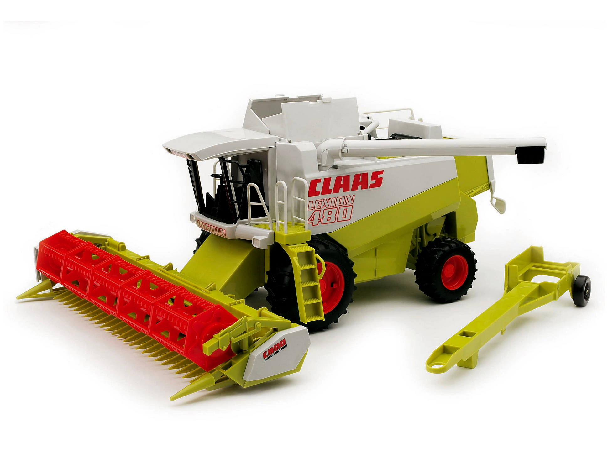 A Claas Lexion 480 kombájn mozgatható, leválasztható kaszaszerkezet lehúzható görgőjével fel lehet billenthető és rögzíthető. A szalma szeletelőt is fel lehet billenteni, és a gabona cső kifordul. Megnyílik a szemétgyűjtő szárnya és a nyílása, a forgószűrő felfelé fordul, és a levehető kaszaszerkezetet a mellékelt pótkocsi vontathatja. A futófelület gumiabroncsai kitölti a képet.