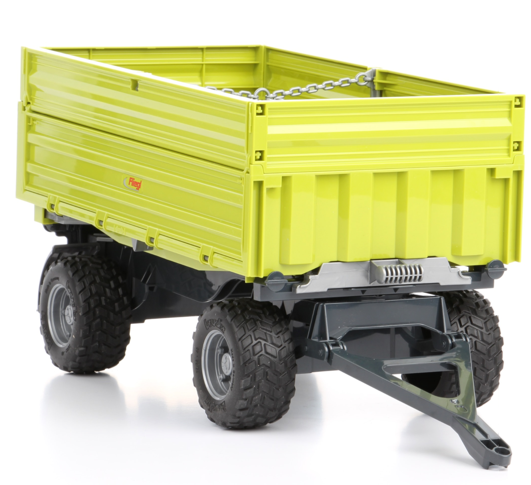 A BRUDER Fliegl háromutas dömper egyfajta a játékszegmensben. Soha nem volt lehetőség arra, hogy a gyerekek olyan komplex pótkocsit irányíthassanak, amely olyan könnyen lehajtható három oldalra. A kihívás az volt, hogy megfeleljen a reális funkciók és a kivételes működőképesség kombinálásának igényeinek. A pótkocsi elülső oldala csúsztatható vezérléssel rendelkezik az innovatív billenőegység számára. Ha a vezérlőkart balra mozgatja, a pótkocsi balra fordul; Ha jobbra mozgatja, a pótkocsi jobbra fordul. Ha a kart a közepére mozgatja, akkor csak a pótkocsi hátrafelé haladását teszi lehetővé. Gyermekjáték akkor: állítsa be az irányt a vezérlőkarral, és a pótkocsit csak erre az irányra lehet billenteni. A tetején rögzített, nyitott oldalak szintén egy háromutas dömper részét képezik. A kis gazdák fülről fülig mosolyognak? mint a szerepmodellük? a betakarítás pl. Az oldalsó zár ugyanolyan egyszerű, mint a billenő mechanizmus. A bal, jobb és hátsó oldal alatt egy csúszó zár van.