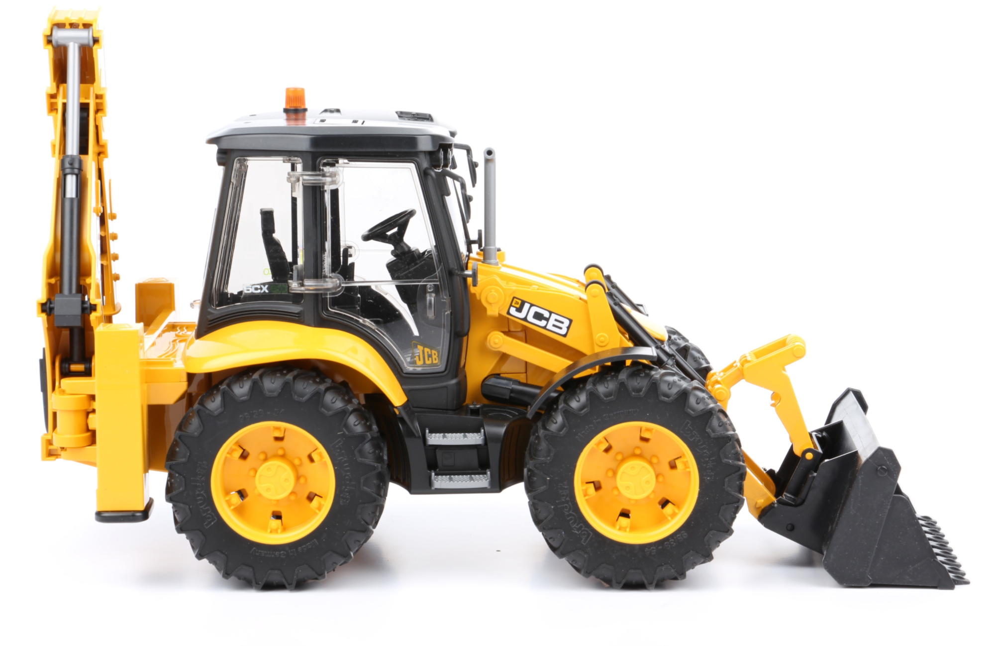 A JCB 5CX eco kotró-rakodó egy igazi multi-tehetség. A billentő, reteszelő és cserélhető homlokrakodó vödör mellett a kotró-rakodó egy teljesen működőképes hátsó vödör kotrógéppel van ellátva, amely két járókerékkel rendelkezik a jármű stabilizálásához és bármilyen ásatási feladathoz. A homlokrakodó karja egykezes működési mechanizmussal van összekötve, és ügyesen elhelyezett triggergombot tartalmaz. A forgatható vezetőülés és a nyitó hátsó ablaknak köszönhetően a rendelkezésre álló BRUDER építőmunkások képesek a kotró-rakodó minden funkciójának vezérlésére. A JCB teljes ellenőrzése, még akkor is, ha az építőmunkát a két nyitott ajtó egyikének segítségével helyezték el a hátsó fedélen keresztül szerelt további BRUDER húzócsatlakozónak köszönhetően. A négykerék-kormányzás biztosítja a szoros fordulópontot is. A futófelület gumiabroncsai mellett a JCB 5CX öko-kotró-rakodógépe terepjáró első tengellyel is rendelkezik, amely szinte bármilyen felületen megtartja a tapadást. Egyszerűen tárolja a további húzó linket a jármű alsó részén, miután elvégezte a munkát.