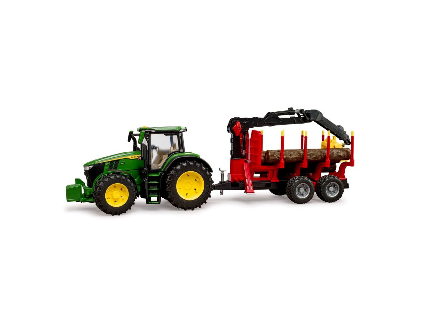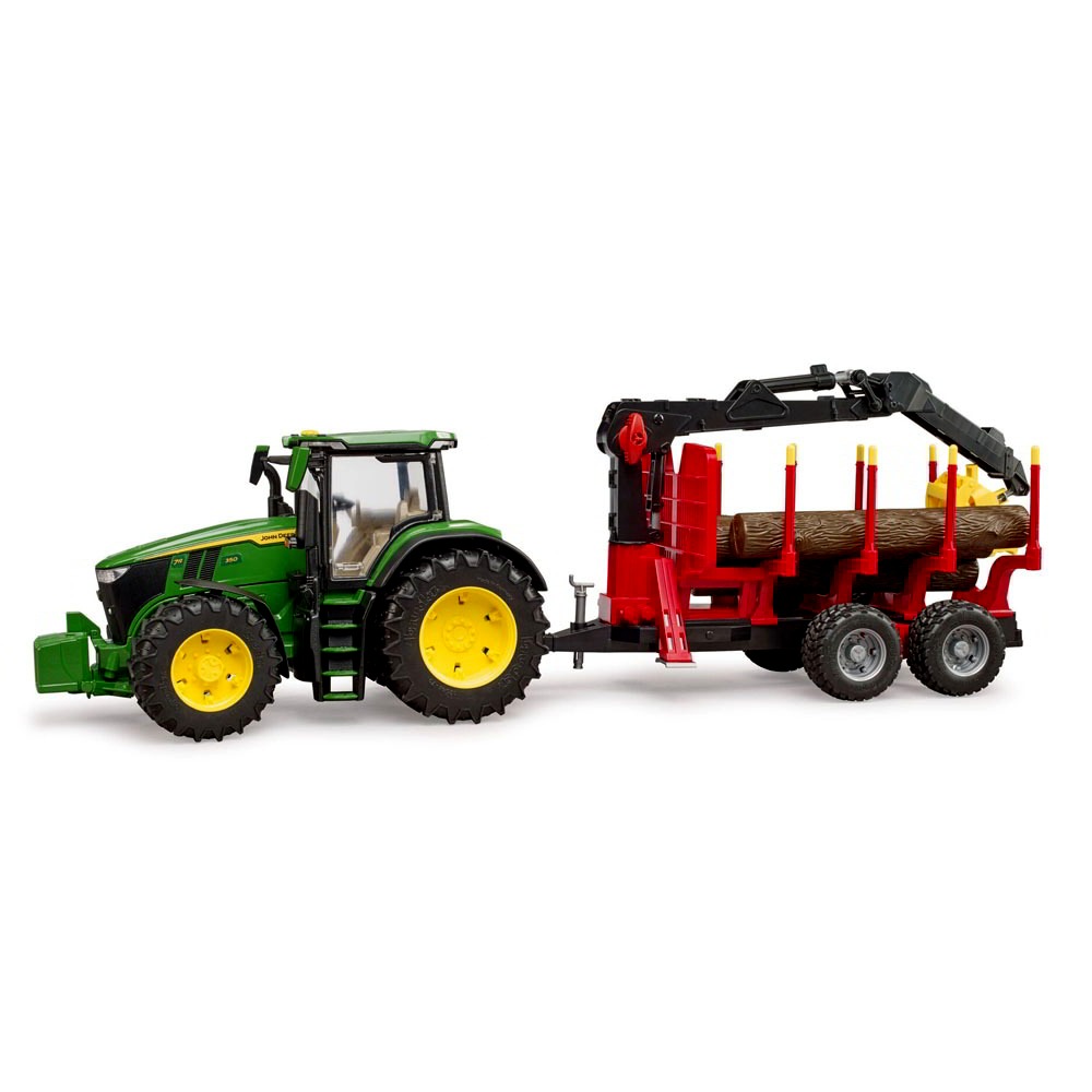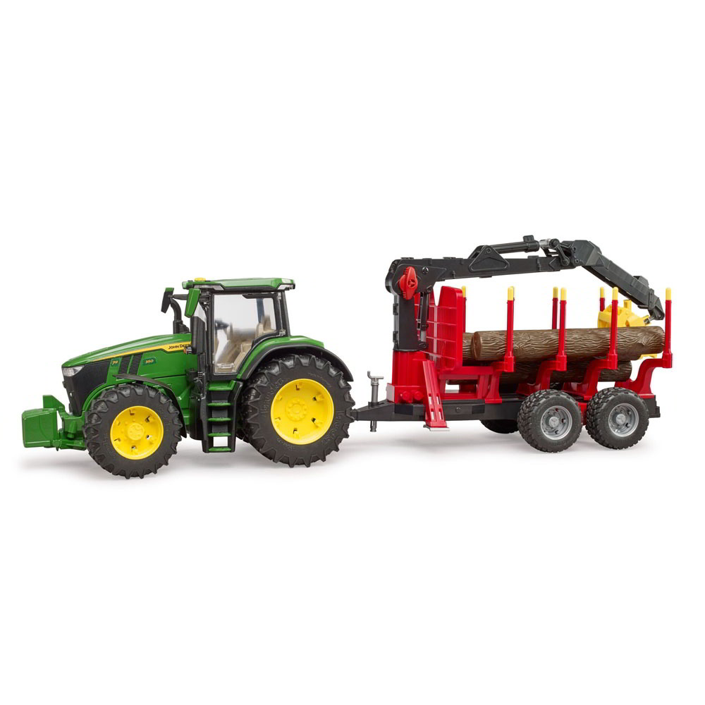 A traktor egy funkcionális erdészeti utánfutóval érkezik, amelyet már négy fatörzzsel láttak el. Az utánfutó forgatható és elforgatható rakodódaruval van ellátva, így a fatörzseket szállíthatja, be- és kirakodhatja. A modern erdészeti utánfutó állítható karokkal rendelkezik, ami azonnal játékra csábít. A Bruder mezőgazdasági szortimentből további utánfutók is csatlakoztathatók ehhez a traktorhoz.