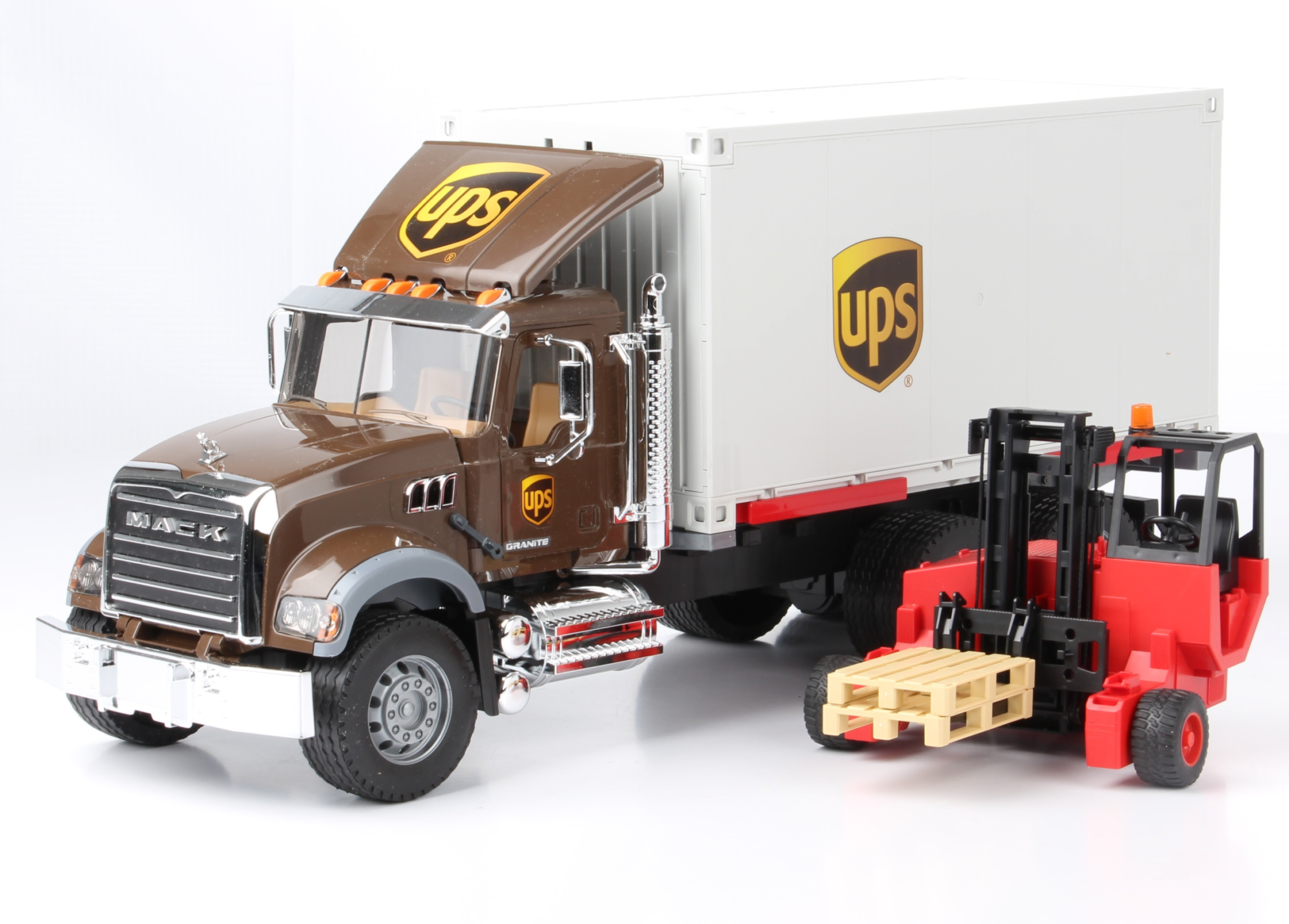 A MACK Granite targonca cserélhető konténeregységgel rendelkezik, amely a világszerte működő UPS szolgáltató márkájú. A reális vezetőfülke, nyitó ajtók, összecsukható visszapillantó tükrök, sok króm hatású tartozék és egy hajtogatott motorháztető köszönhetően funkcionális, teljes körű tehetség. Az eredetihez hasonlóan a modell a hátsó lengőajtók segítségével is betölthető vagy kirakható. Ennek a járműnek a további kiemelkedő lehetősége a cserélhető egység, amely automatikusan kioldható a járműből, kihúzva és kihúzva a tartókarokat a tartály felemeléséhez, és lehetővé teszi, hogy a targonca elmozduljon a készüléktől. A targonca egy rugalmas targoncát szállít rugalmas betöltésre és kirakodásra, amely szintén alkalmas zárt térben. A targonca "