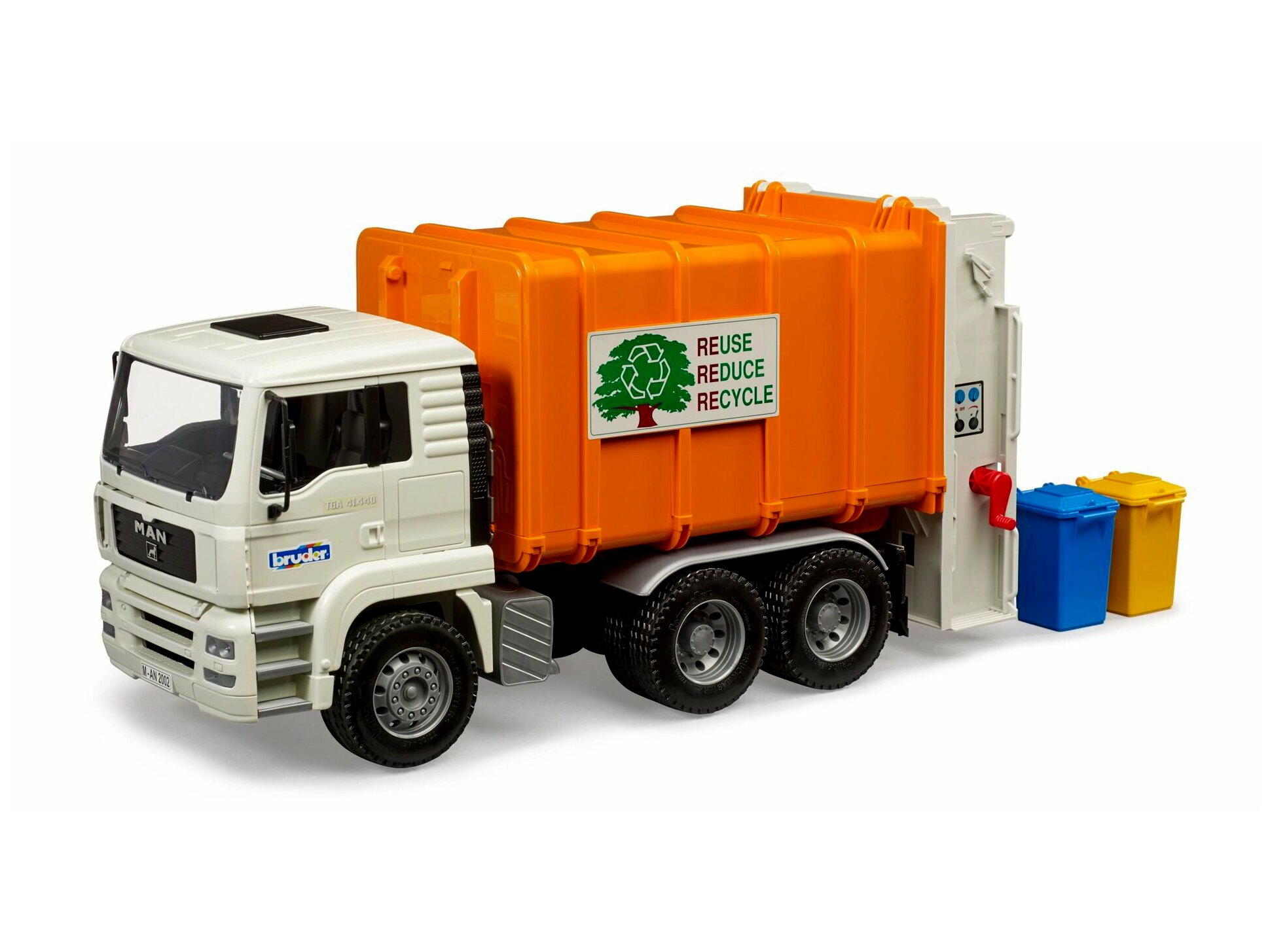 Az autó fülkéje dönthető, így nagyszerű kilátás nyílik. Ez a szemeteskocsi két spirális szállítószalag segítségével szállítja a szemetet a préskamrába. Az autó ürítése a nyitható hátsó ajtókkal történik, amelyek automatikusan záródnak a véghelyzetben. A csomag két szemeteskukát tartalmaz.