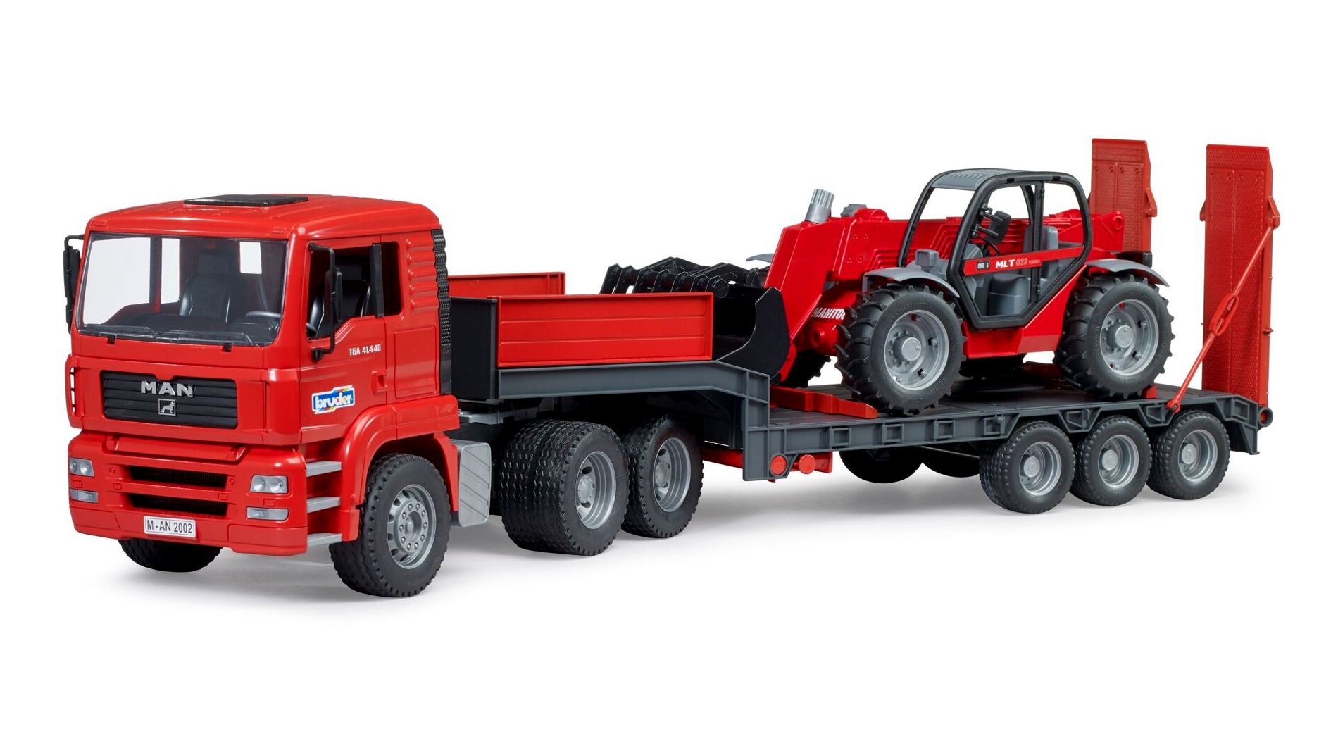 Az építkezése elengedhetetlen nehéz szítási feladatok megoldására, mint például nagy építőgépek egyik helyszínről a másikra történő szállítása, gyakran alkalmaznak alacsony platós teherautókat. A Bruder Baufahrzeuge témavilágában a MAN TGA alacsony platós teherautó egy Manitou MLT 633 teleszkópos rakodót szállít a következő munkaterületre. Ez a lenyűgöző jármű számos tulajdonsággal rendelkezik, amelyek a MAN alacsony platós modelljét különlegessé teszik: például teljesen funkcionális forgócsapos kapcsolat a pótkocsin, lehajtható támaszok és mozgatható rámpák. Az útitársként érkező irányítható teleszkópos rakodó kinyújtható és magasságban állítható teleszkópkarokkal, valamint levehető kanállal rendelkezik.