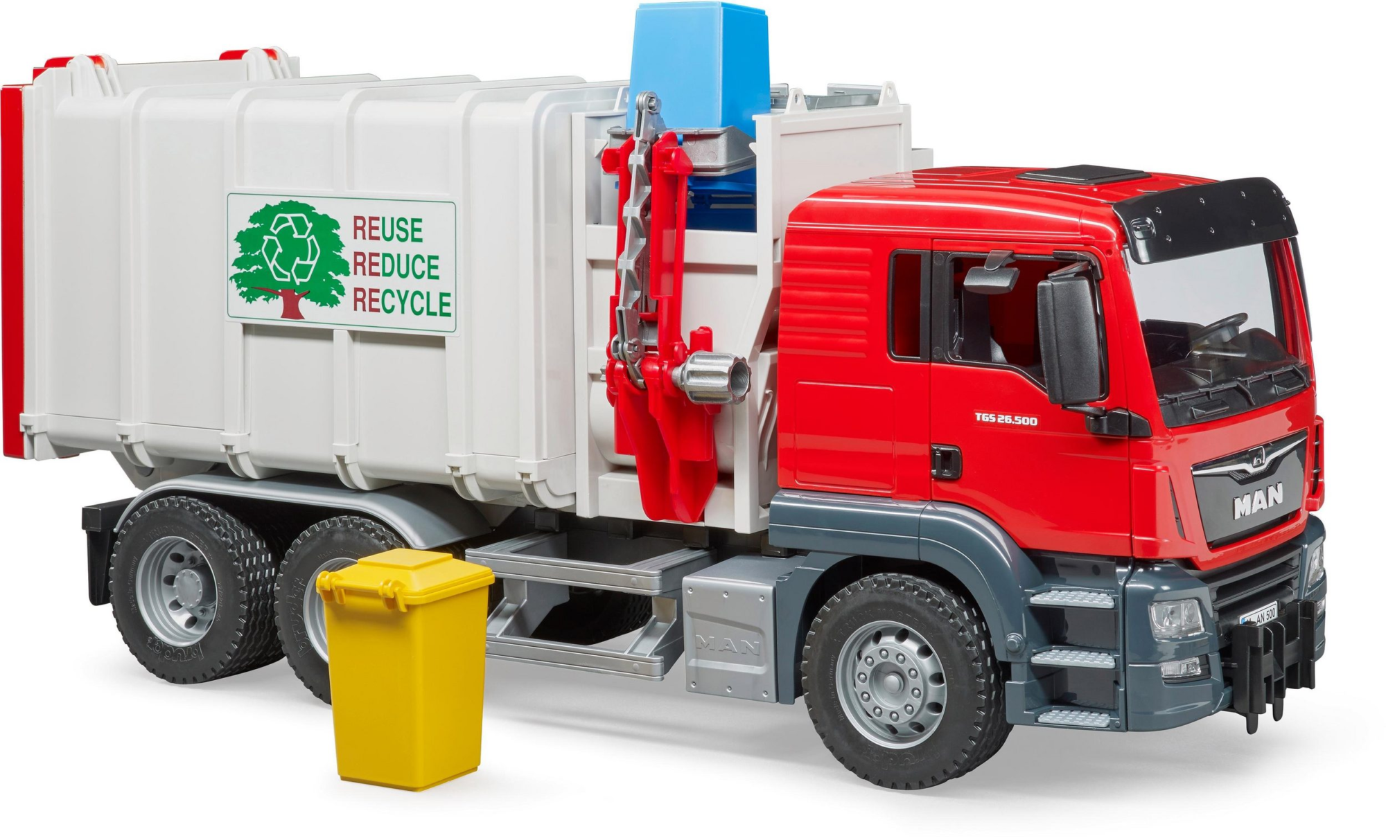 A MAN TGS a tökéletes, teljes körű jármű az építkezésekhez, a hosszú távú közlekedéshez és a helyi forgalmazáshoz. A tartós kialakításnak köszönhetően, amely erőteljes motorokkal rendelkezik, és az átlag feletti hasznos terhelést biztosítja, ez a targonca a gyakran leírt "teljes körű jármű" prototípusa. A BRUDER MAN TGS flottájához most már egy csúcsminőségű oldalsó rakodóhulladék-gyűjtő jármű került hozzáadásra. Az emelőegység az oldalról kifelé mozog, hogy megragadja a tartályokat és ürítse ki őket anélkül, hogy szükség lenne egy másik személyre. Két csavarkompresszor mozgatja a hulladékot a rakodó test belsejébe hátrafelé. Miután kinyitotta a csomagtérajtót, a test elfordul, hogy kiürítse a járművet. A 02607 szettből származó kis szemetesedények megfelelnek a hulladékgyűjtő járműnek.