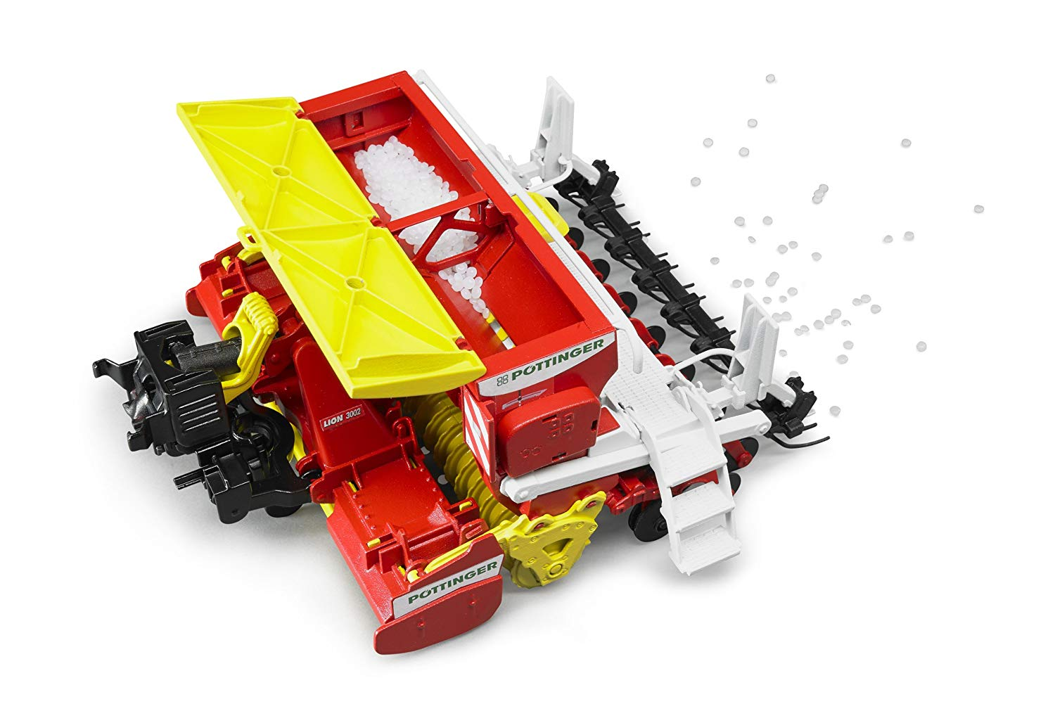 A Pöttinger Vitasem 302ADD kombinált rotációs borona és vetőgépe a mezőgazdaságban a talajműveléshez és a magok különösen gyors és pontos adagolására alkalmas. A Pöttinger által gyártott kombinált egység középpontjában a nagyobb pontosságú vetés és a betakarítás során nagyobb hozam elérése áll. A BRUDER sportmodellje egy olyan illesztőfelület, amely lehetővé teszi a kombinált forgóboronák és vetőgépek használatát minden olyan traktoron, amely a termékcsalád részét képezi. Az integrált emelőszerkezet lehetővé teszi számukra, hogy az egységet felemeljék és leengedhessék, így a gyerekek pontosan szimulálhatják a valós közlekedési és munkahelyi helyzetet. A BRUDER által kínált opcionális játékfigurák a lehajtható lépcsők segítségével felmászhatnak a kombinált egységre, hogy például megnyitják a vetőmagtartályt. A munka megkezdődhet, amint a tartályt betöltik, a kombináció a traktorhoz van csatlakoztatva, és a kimeneti szelep nyitva van. A részletek sokasága előtérbe helyezi ennek a játéknak a vizuális hatását, így a gyerekek még reálisabb módon játszhatnak.