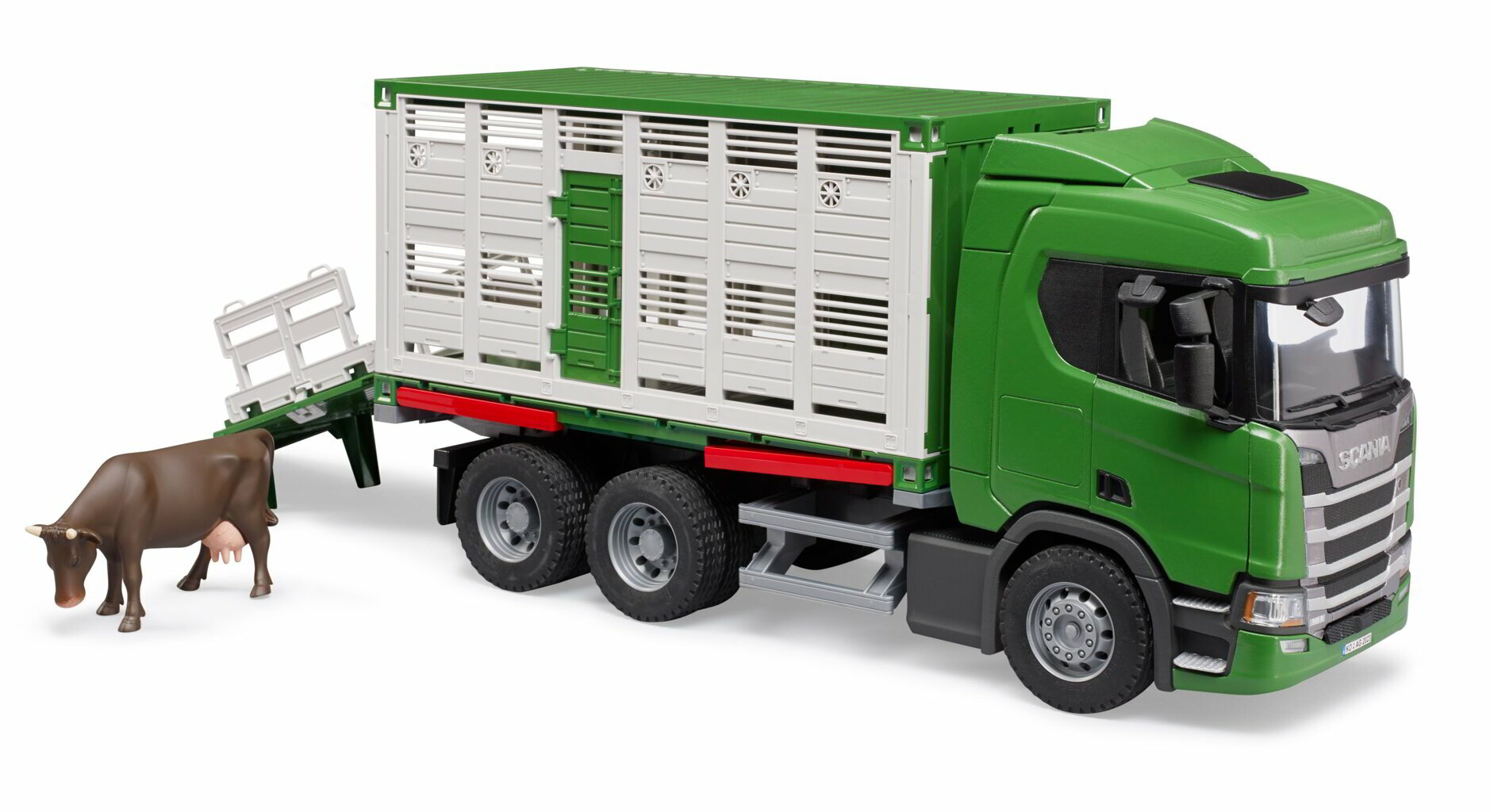 A Scania transzporter mindennel fel van szerelve, ami az állatok szállításához szükséges. Az összehajtható és kihúzható rámpáknak köszönhetően az állatok be- és kirakodása egyszerűbb és egyben biztonságosabb. A hordozó belsejében etetővályúk és belső elválasztó rács található, amelyek elegendő helyet biztosítanak a különböző típusú állatok számára. A vezetőfülke a tipikus Scania dizájn szerint lett kialakítva, hogy a modell a lehető legjobban hasonlítson az eredetire. A termék egyéb jellemzői közé tartozik az összecsukható tükrök és a nyitható ajtók. A csomag egy tehénfigurát tartalmaz. A modell kiegészíthető további tehenek (Bruder 2308) és bikák (Bruder 2309) figurákkal, vagy például fény- és hangmodullal (Bruder 2801) .