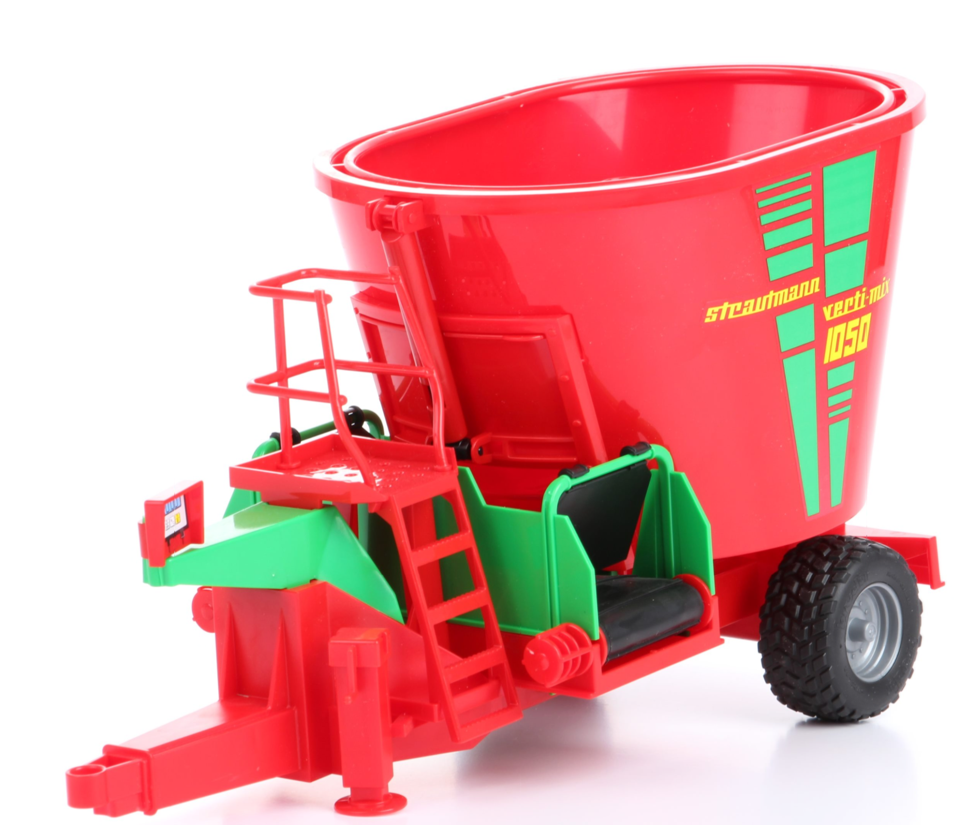 A Strautmann takarmánykeverő Verti-Mix 1050 takarmánykeverő keverőedényében lévő vágók (műanyag) forognak, és a tartály kimeneti csúszka kinyitható. A keresztszíj teljesen működőképes és a digitális kijelző elfordul. Az összecsukható támasztóláb biztosítja a stabilitást és a futófelület gumiabroncsát. A játék kedvéért a Strautmann Verti-Mix 1050 takarmánykeverő kombinálható a Profi sorozat összes traktorjával (nem tartozék).