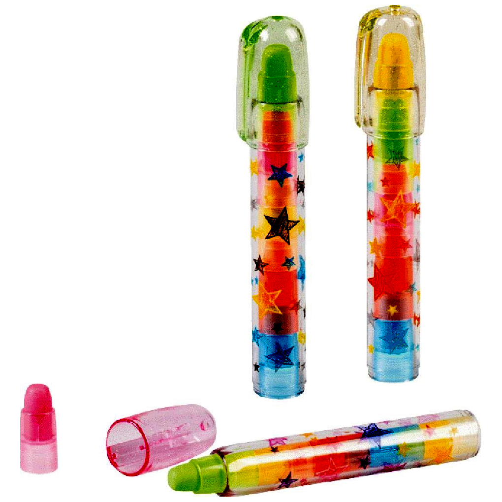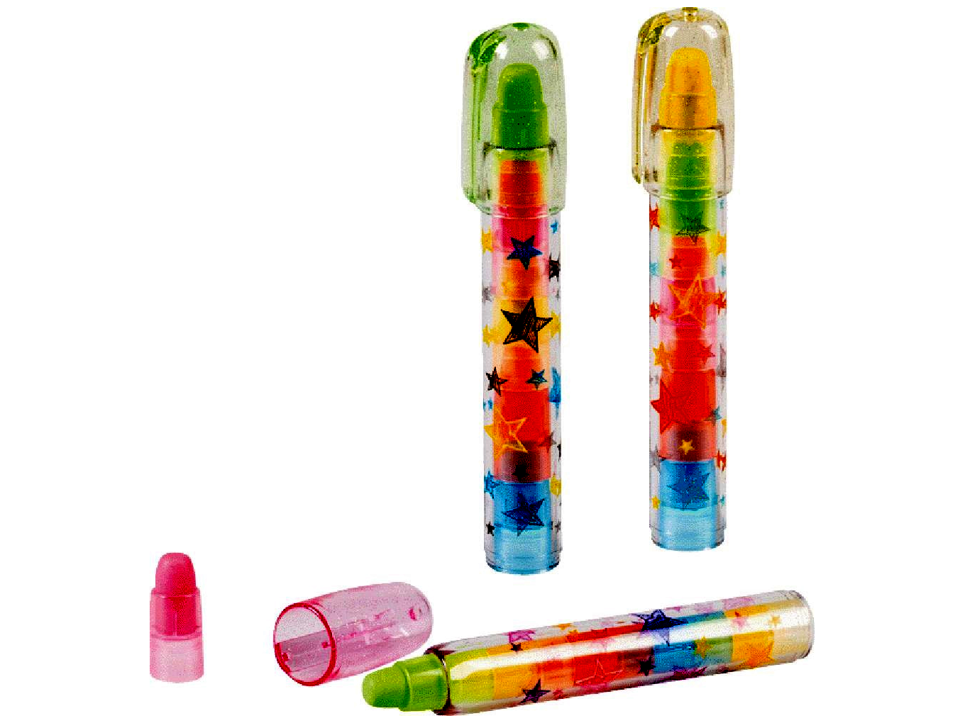 Terméktípus: radírceruza Kialakítás: tolóbetétes (mechanikus radír) Minta: csillagos Színek: többszínű kivitelek (vegyes színek) Felhasználás: grafitceruzás írás és rajz törlésére Ajánlott felhasználók: iskolások, diákok, irodai dolgozók, hobbi rajzolók Forma: ceruza jellegű ház, jó fogású hengeres test Előnyök: pontos, tiszta radírozás, nem koszolja a kezet, könnyen adagolható a radírhossz