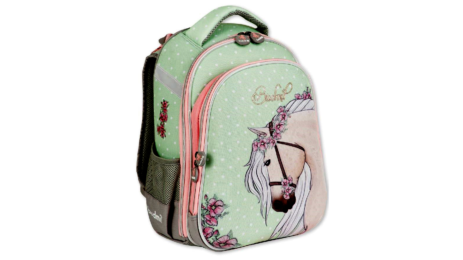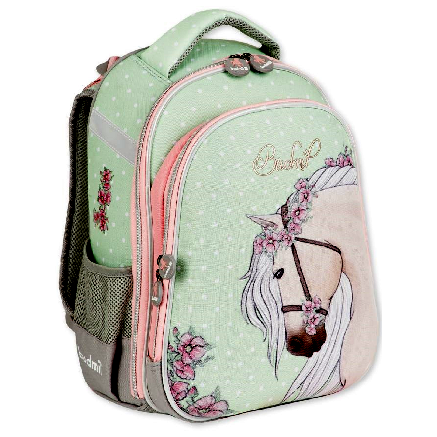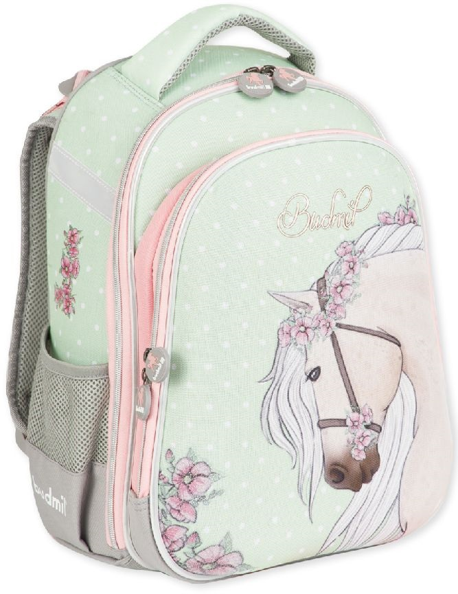 A mutatós ló minta és a harmonikus zöld–rózsaszín színkombináció egyszerre modern és kislányos. A dizájn úgy lett megalkotva, hogy a gyerekek büszkén hordják a táskát, szívesen készüljenek vele nap mint nap az iskolába.