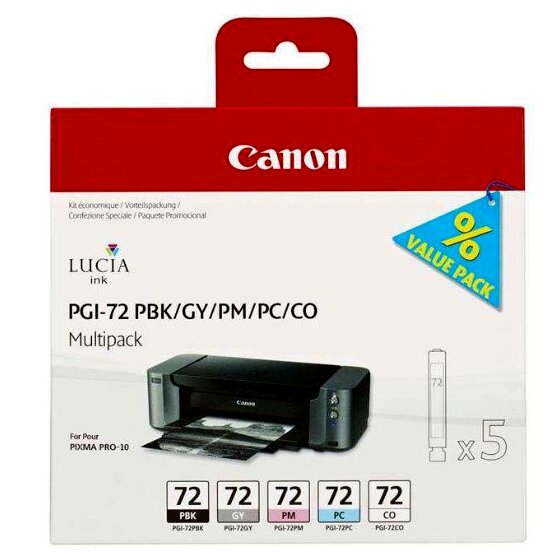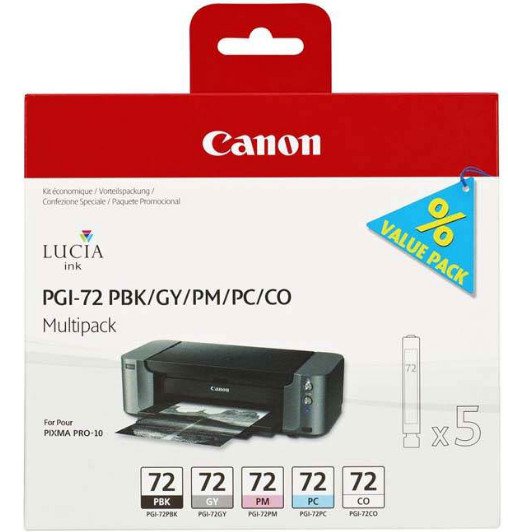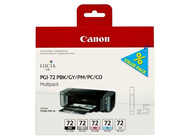 - Tartalmaz egy PGI-72 fekete fotó tintapatron, a PGI-72 szürke tintapatron, egy PGI- 72 fénykép Magenta tintapatron, OFJ-72 Photo cián tintapatron és PGI-72 Chroma-optimalizáló tintapatron.