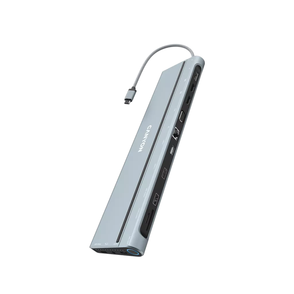 Ha laptopja C típusú USB-vel van felszerelve, ez az univerzális CNS-HDS90 dokkoló, amely a népszerű modell 3. generációja, 14 beépített porttal a lehető legnagyobb mértékben javítja csatlakozási tulajdonságait. A Display Port (4Kx60Hz) és a VGA használatával laptopját egyszerre négy monitorhoz csatlakoztathatja. Az akár 100 W-os USB-C PD töltőport lehetővé teszi a csatlakoztatott eszköz optimális sebességű töltését. Ezenkívül a Canyon HDS90 USB-elosztó beépített 3,5 mm-es audio jack csatlakozóval rendelkezik a fejhallgató/mikrofon számára, SD és TF kártyaolvasó, Ethernet a hibátlan internetkapcsolatért és USB-С 3.2 Gen 2 a gyors adatátvitelért. A 14 portos Hub CNS-HDS90 stílusos és modern megjelenést kölcsönöz a munkaterületnek.