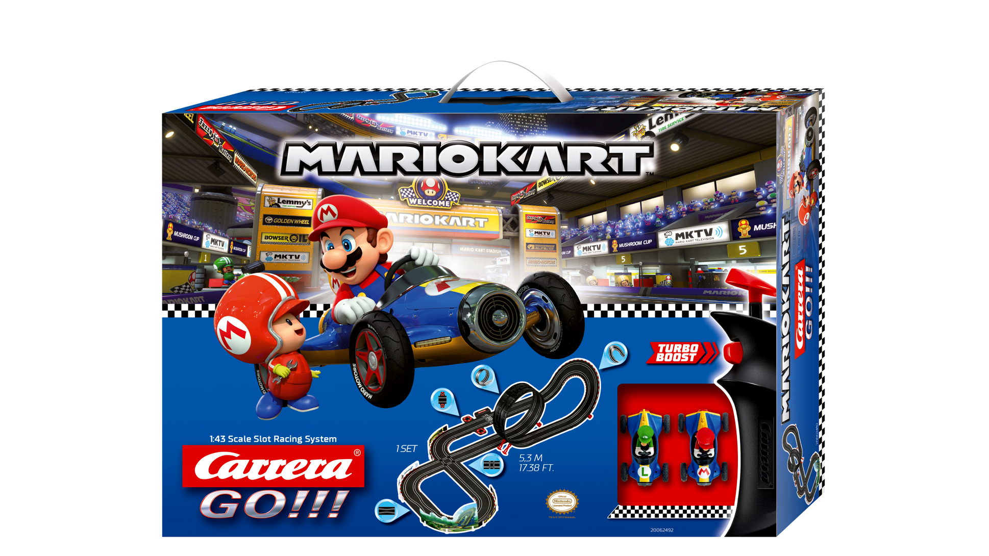 Ez padlógáz-turbóidő! Marionak és Luiginak új versenykocsija van!!! Az új versenyautókkal a testvérek népszerűbbek, mint valaha. Az 5,3 méteres versenypálya garantálja a nagyszerű szórakozást, egy hurokkal, éles kanyarokkal és egy keresztezőséssel.