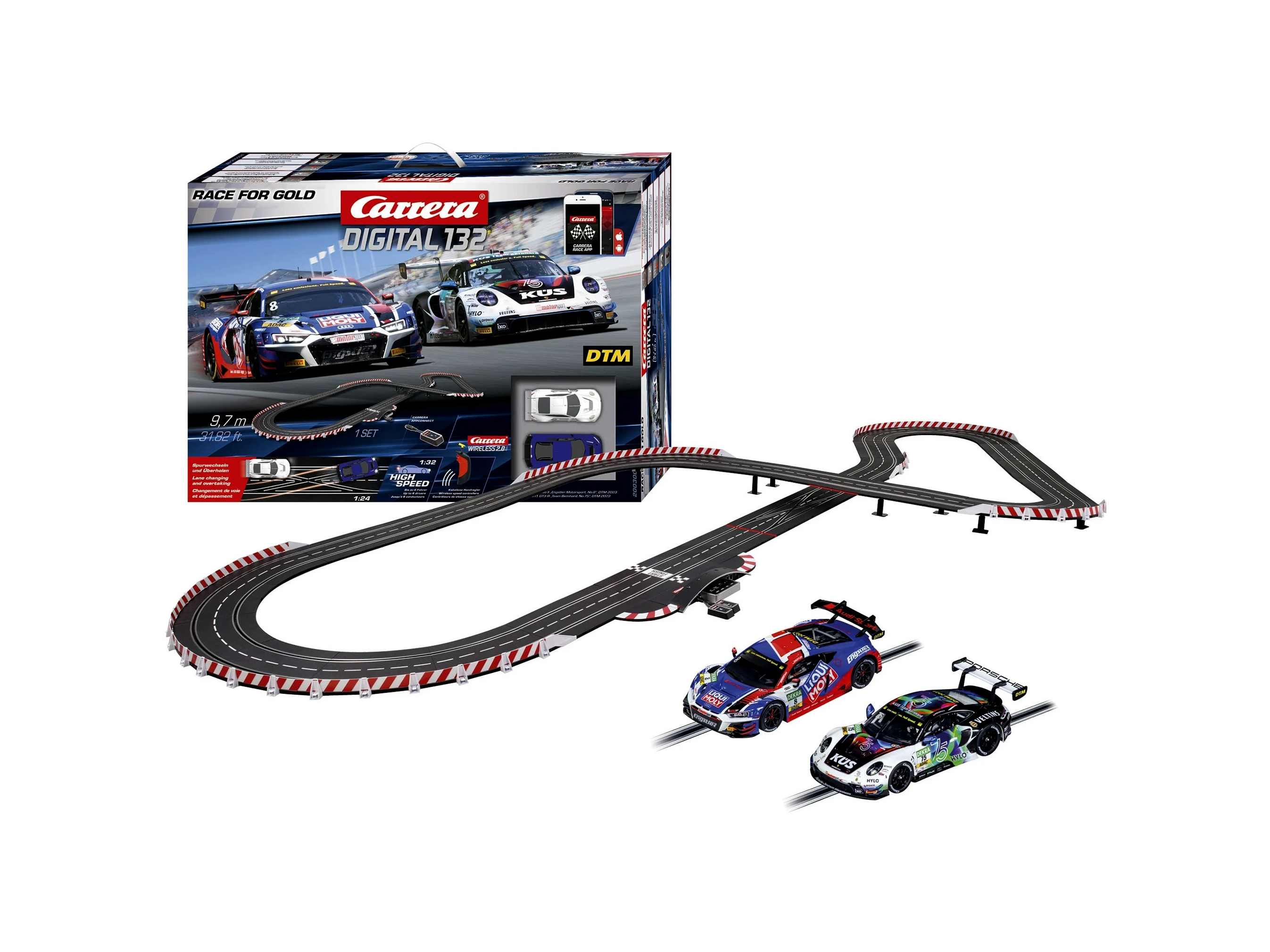 A Carrera DIGITAL 132 Race for Gold versenypálya a legmodernebb technológiával van felszerelve, így ötvözi a realisztikus versenyélményt a könnyű kezelhetőséggel. Az App-Connect lehetőséget biztosít arra, hogy okostelefonodon keresztül tudd irányítani a versenyt, míg a vezeték nélküli vezérlők optimális irányítást biztosítanak.