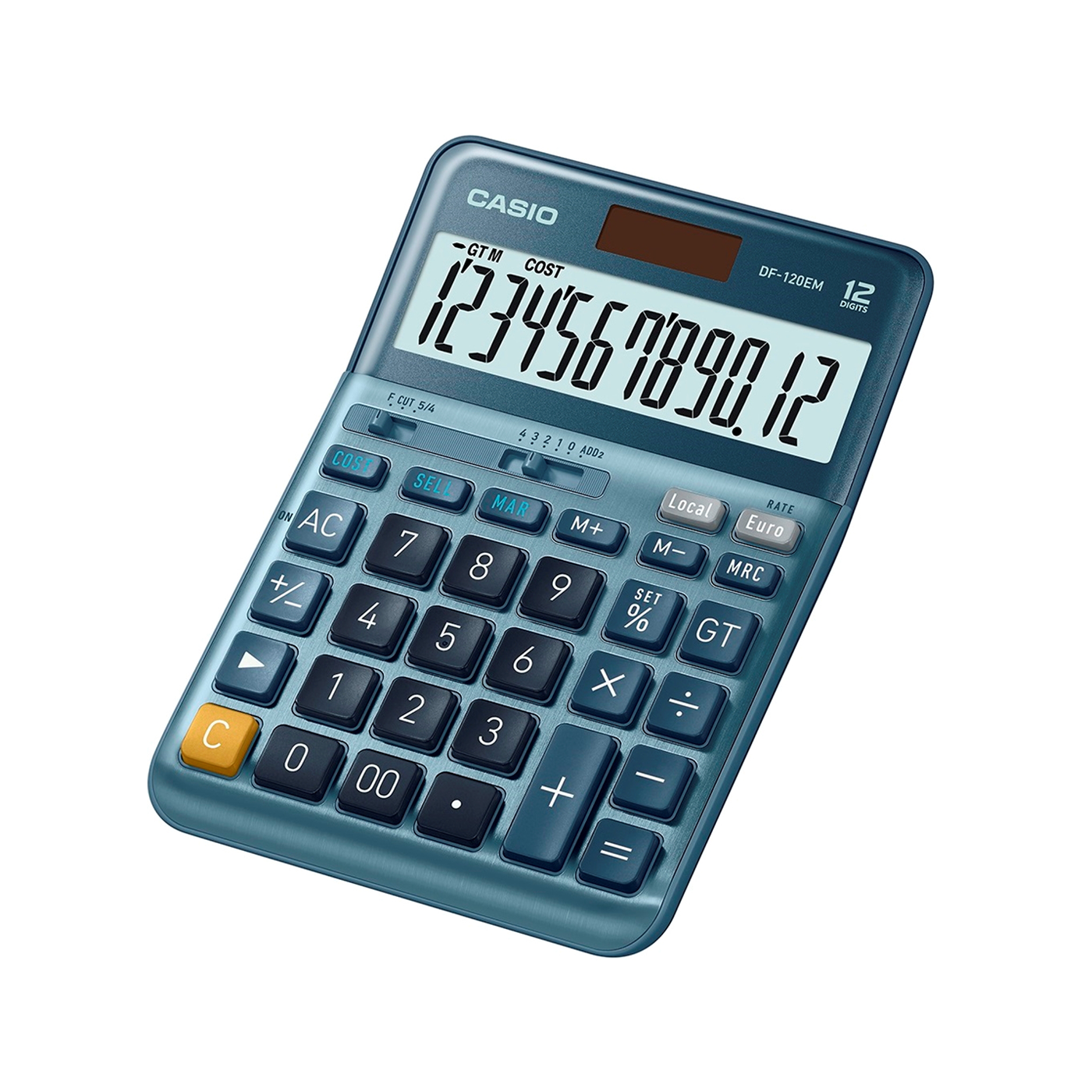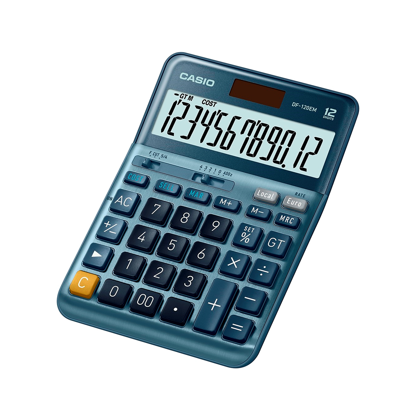 Kiváló minőségű, megbízható, nagy, asztali számológép, elegáns kék színben, alumínium elülső résszel. Nagy, átlátható, döntött 12 számjegyű kijelzővel és csúszásgátló gumilábbal rendelkezik, aminek köszönhetően szilárdan áll az asztalon. Kettős tápegység: napelemmel és elem. A számológép automatikusan kikapcsol. Könnyen használható, ergonomikus, tapadásmentes gombokkal.